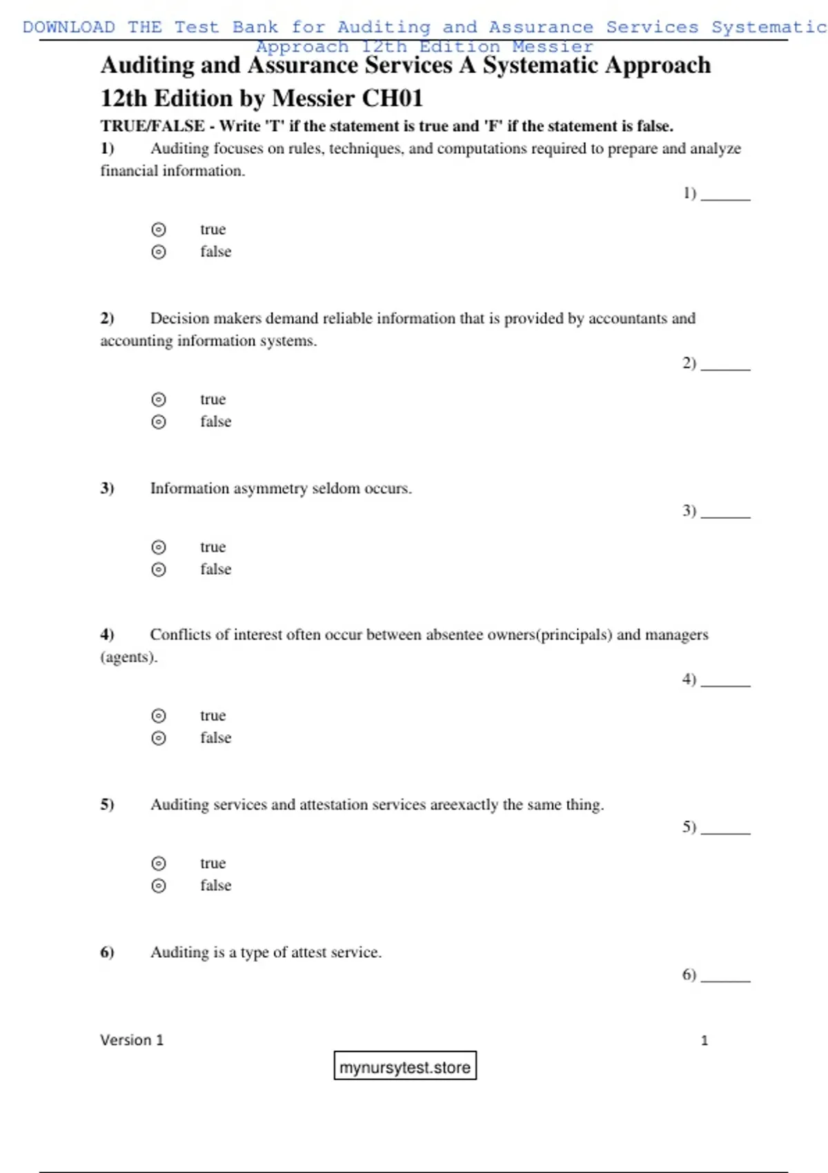 , DOWNLOAD THE Test Bank for Auditing and Assurance Services Systematic