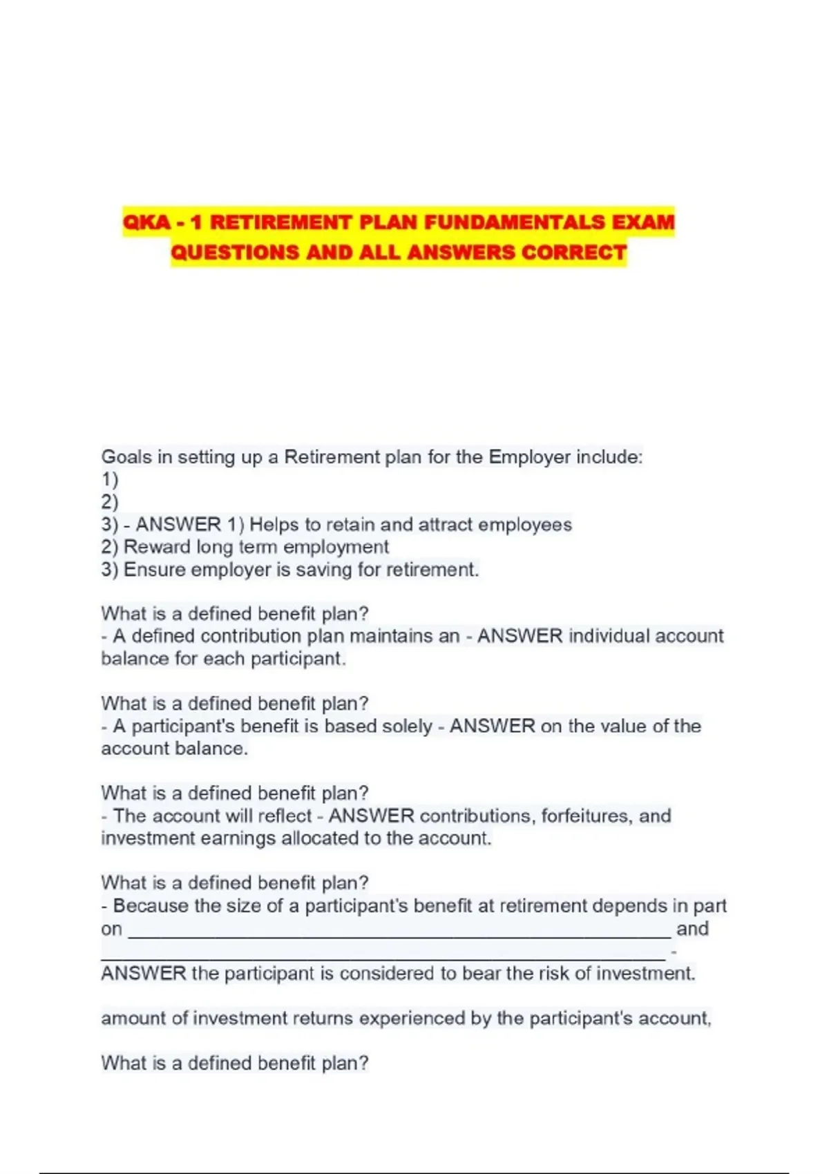 QKA - 1 RETIREMENT PLAN FUNDAMENTALS EXAM QUESTIONS AND ALL ANSWERS CORRECT....