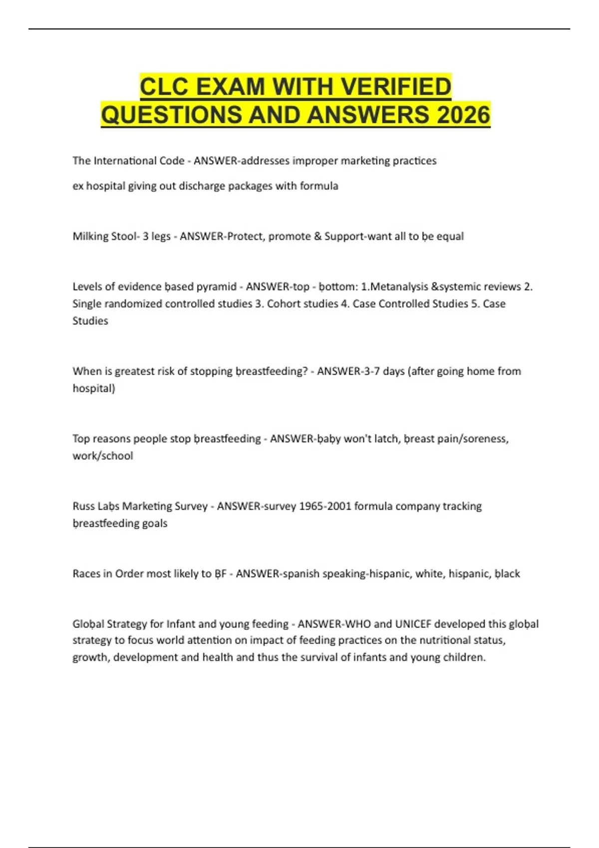 This document provides a comprehensive set of verified questions and answers for the CLC Exam 2026. It covers the key topics and concepts that typically appear on the exam, offering clear and accurate explanations. The material is structured to support effective exam preparation and aligns closely with the most recent exam format.