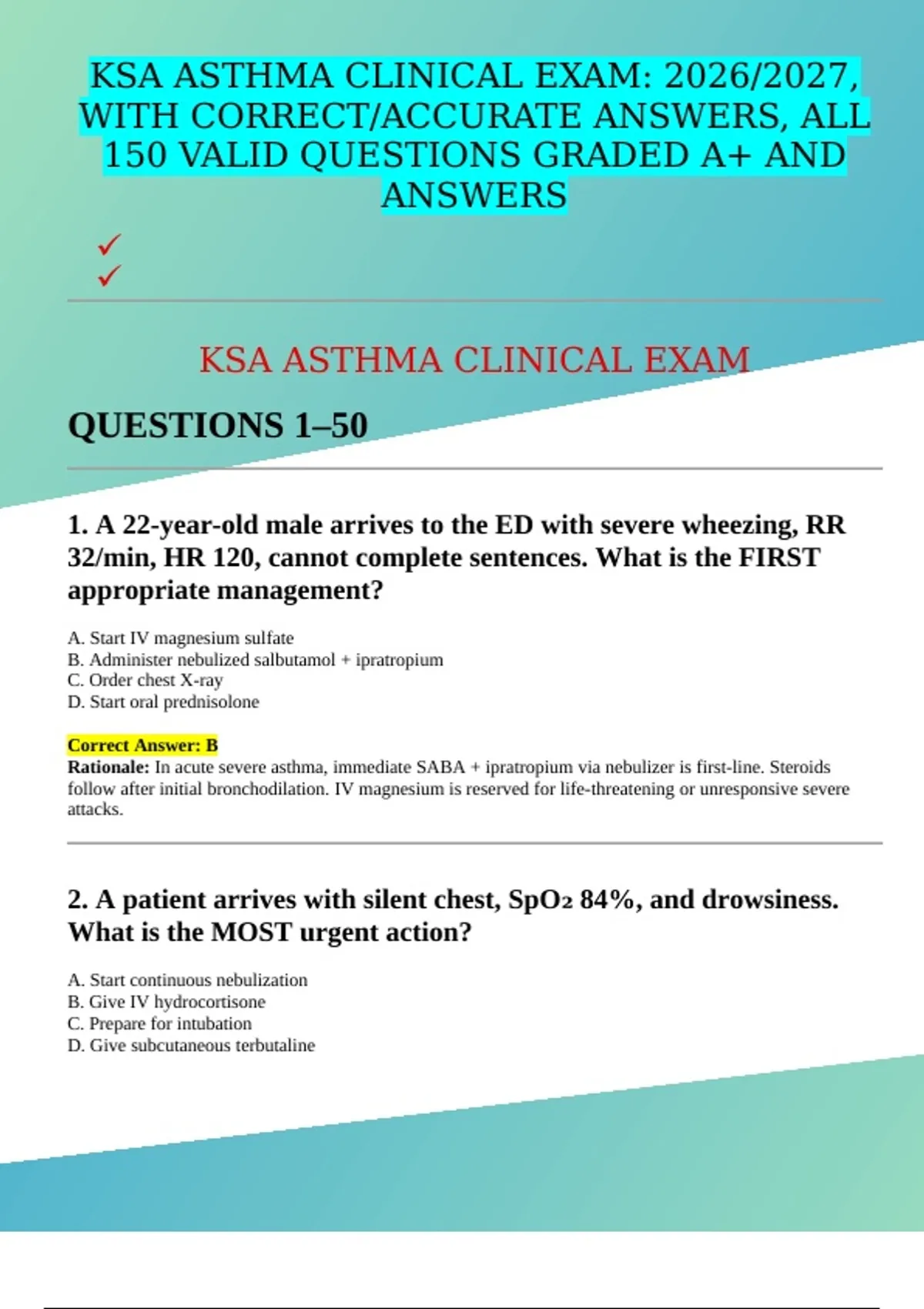 1. A 22-year-old male arrives to the ED with severe wheezing, RR