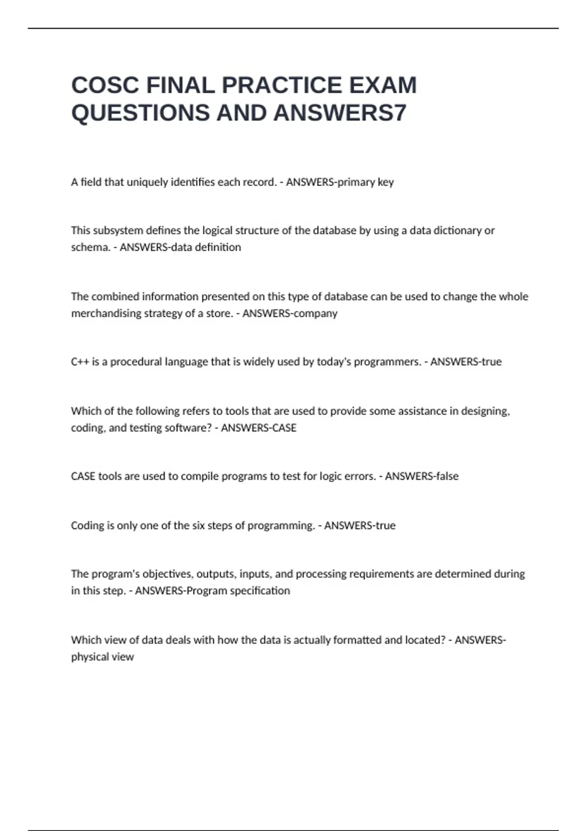 COSC FINAL PRACTICE EXAM QUESTIONS AND ANSWERS