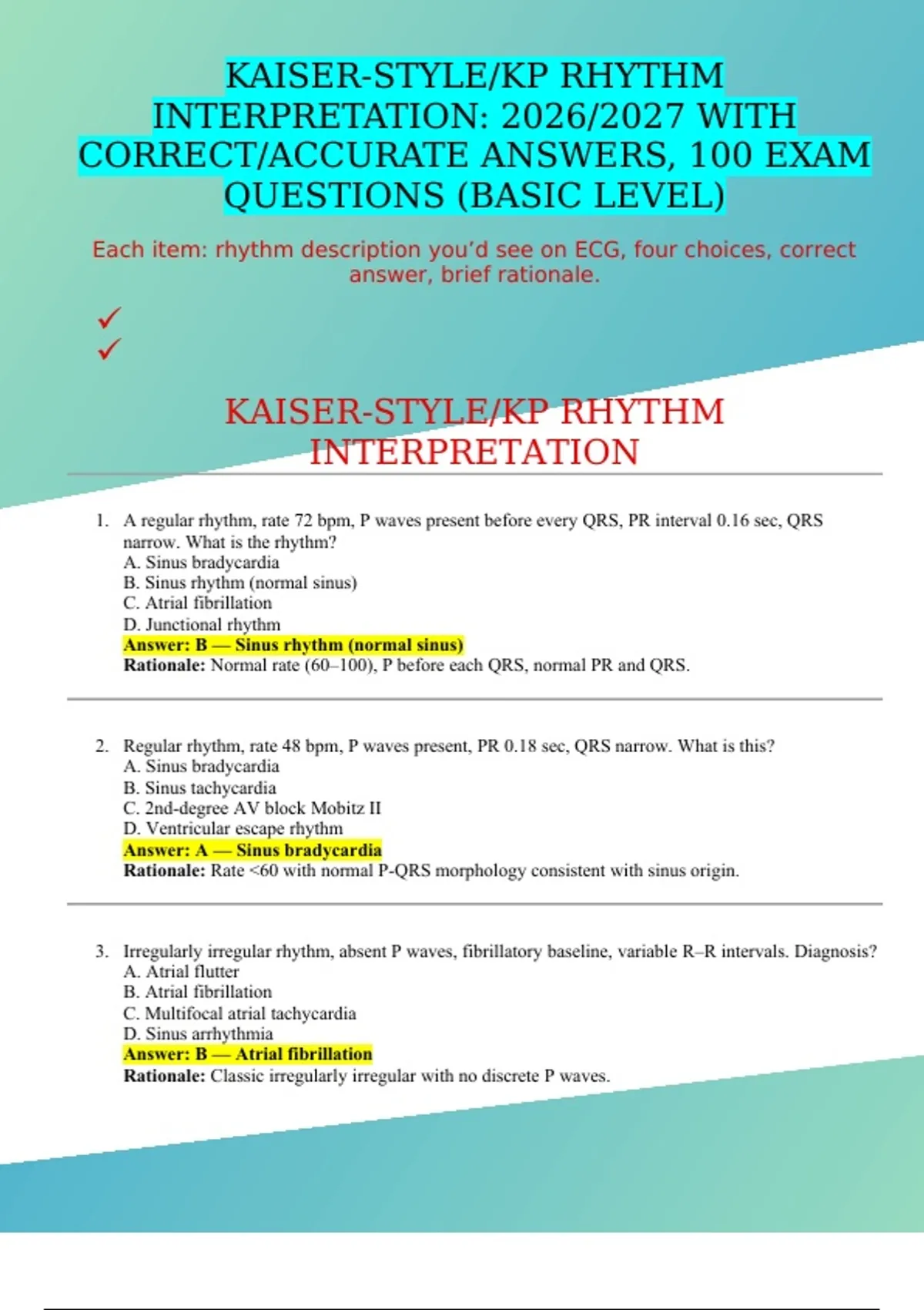 KAISER-STYLE/KP RHYTHM INTERPRETATION: 2026/2027 WITH CORRECT/ACCURATE ANSWERS, 100 EXAM QUESTIONS (BASIC LEVEL)
