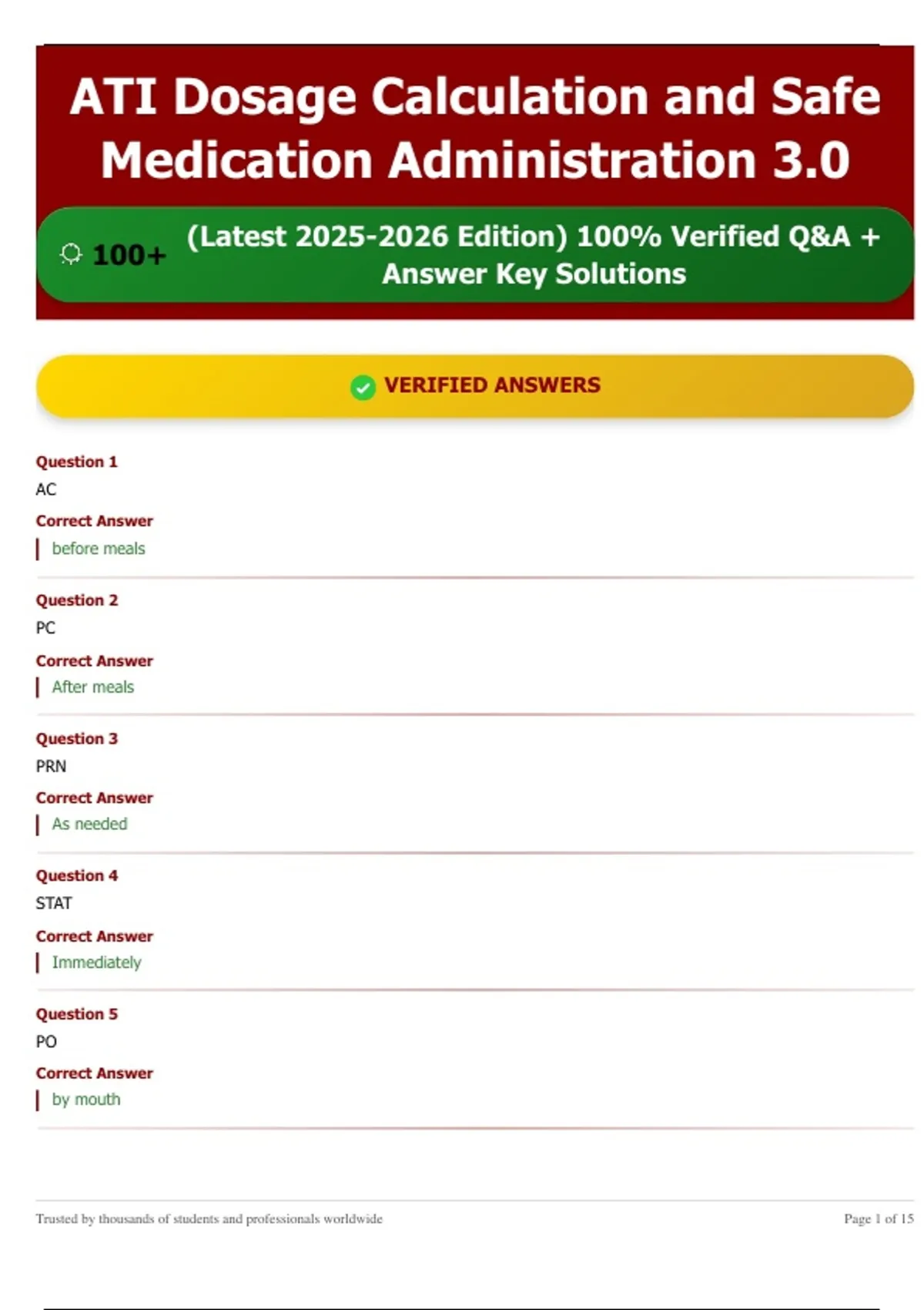 ATI Dosage Calculation & Safe Medication Administration 3.0 | 2025/2026 Latest Edition | 100+ Verified Q&A with Answer Key Solutions | A+ Tier