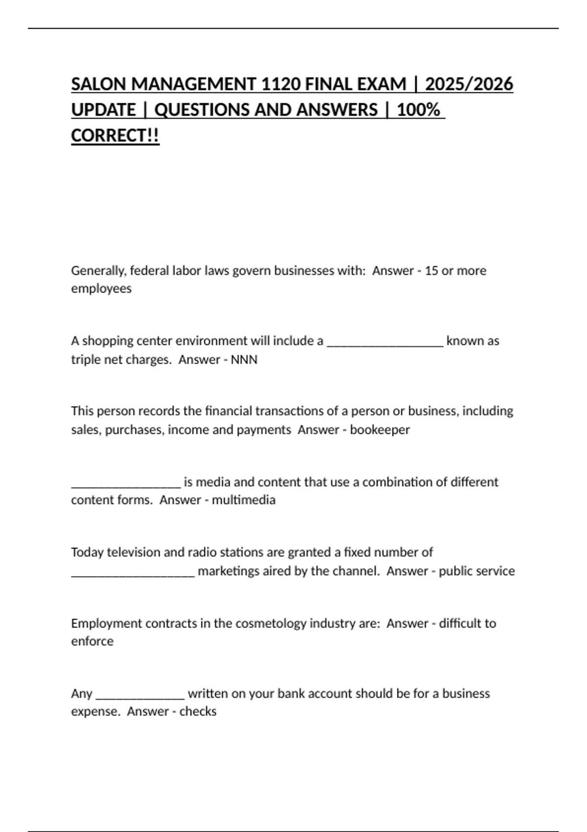 SALON MANAGEMENT 1120 FINAL EXAM | 2025/2026 UPDATE | QUESTIONS AND ANSWERS | 100% CORRECT!!