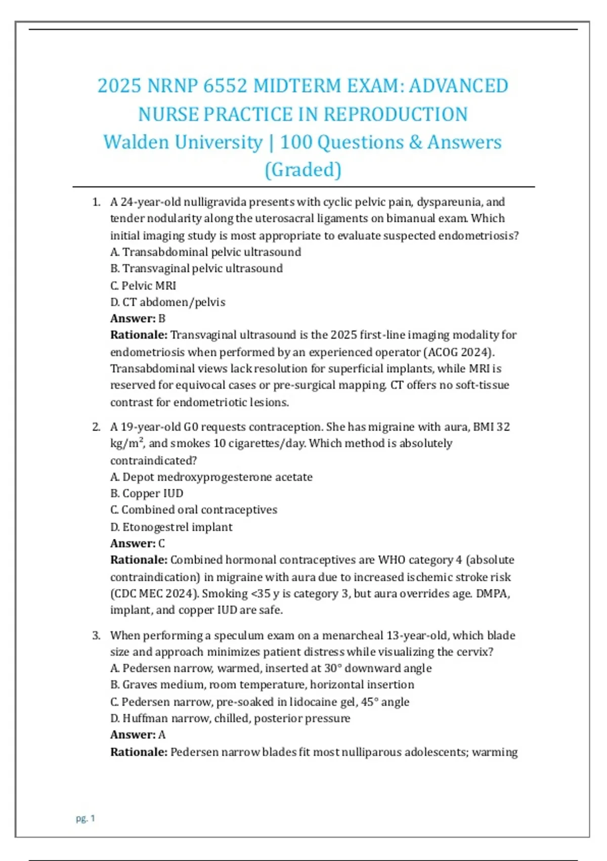 1. A 24-year-old nulligravida presents with cyclic pelvic pain, dyspareunia, and