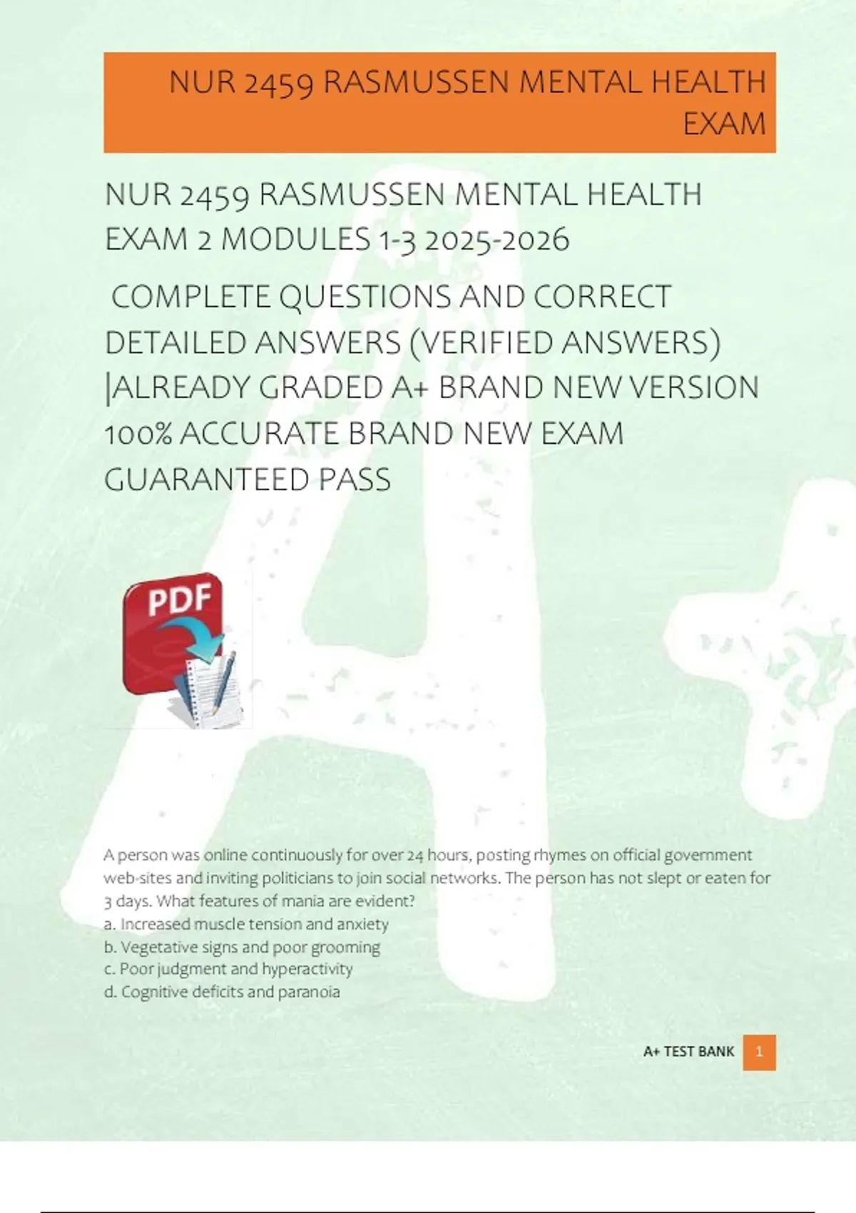 NUR 2459 RASMUSSEN MENTAL HEALTH EXAM 2 MODULES COMPLETE QUESTIONS AND CORRECT DETAILED ANSWERS (VERIFIED ANSWERS) |ALREADY GRADED A+ BRAND NEW VERSION 100% ACCURATE BRAND NEW EXAM GUARANTEED PASS