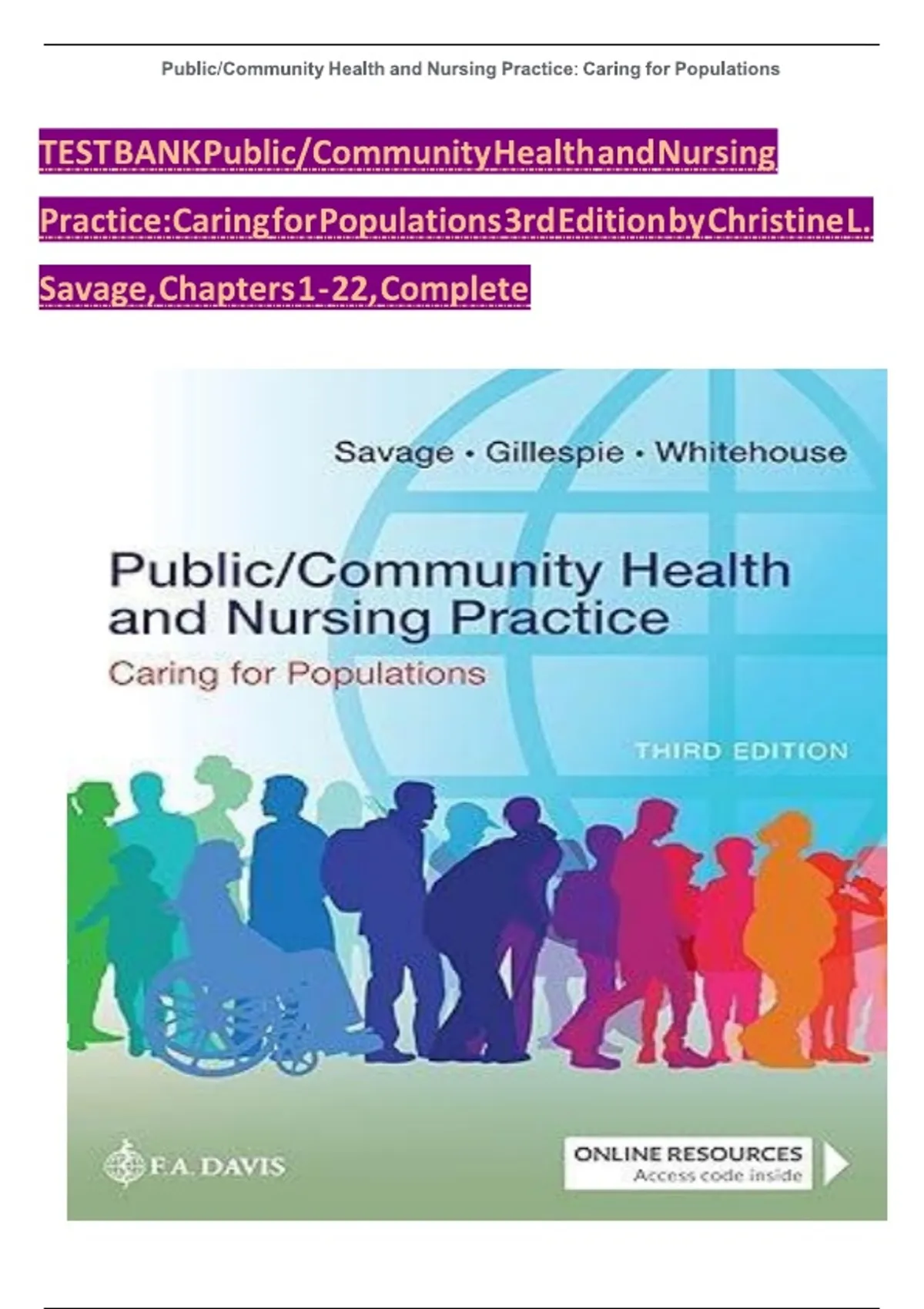 TEST BANK For Public / Community Health and Nursing Practice: Caring for Populations, 3rd Edition, Christine L. Savage, Verified Chapters 1 - 22, Complete Newest Version