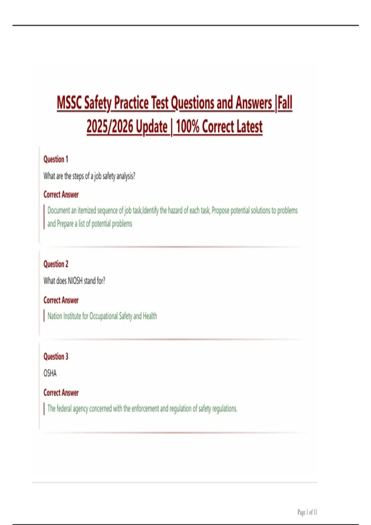 MSSC Safety Practice Test Questions and Answers |Fall 2025/2026 Update | 100% Correct Latest