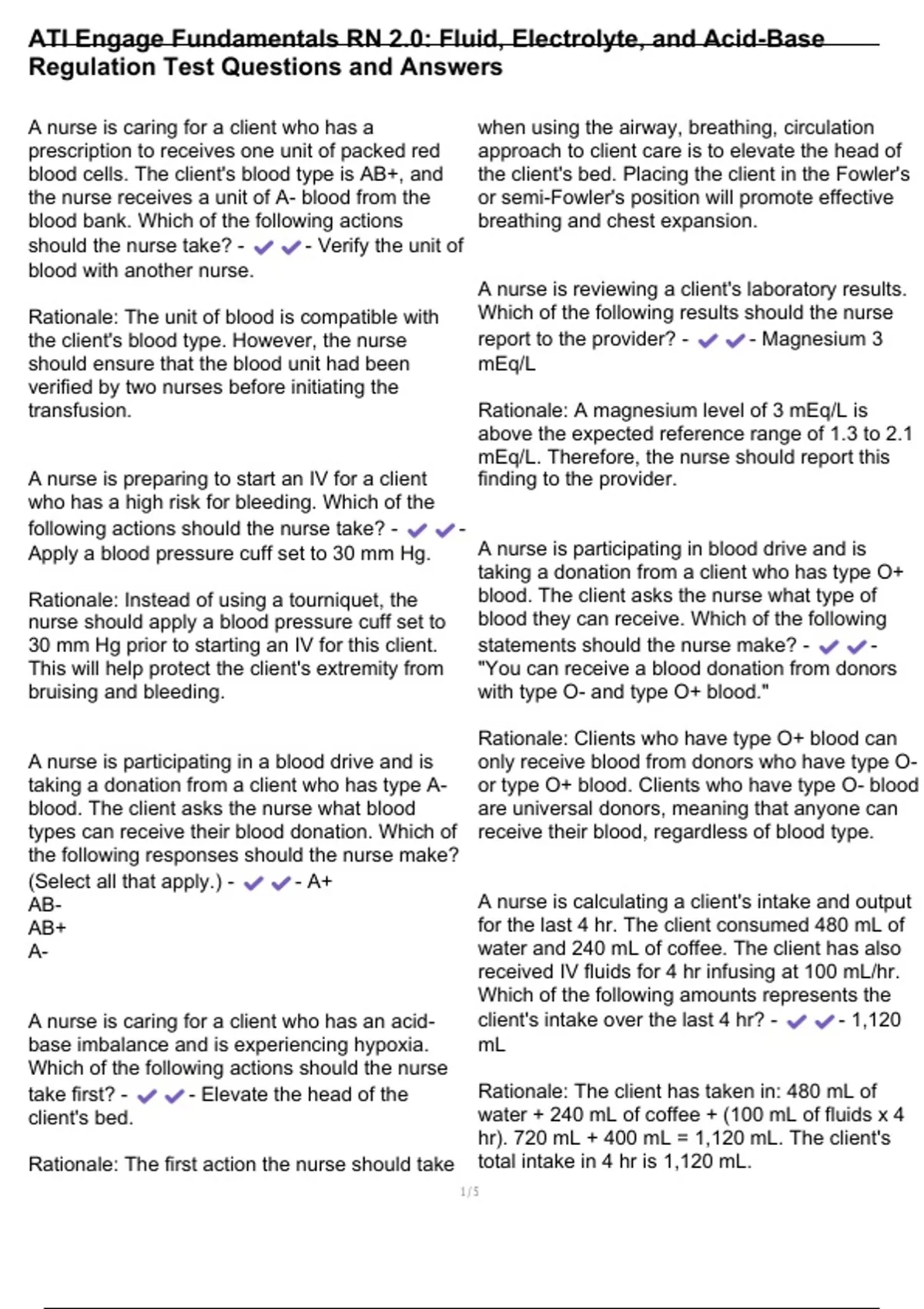 ATI Engage Fundamentals RN 2.0: Fluid, Electrolyte, and Acid-Base Regulation Test Questions and Answers