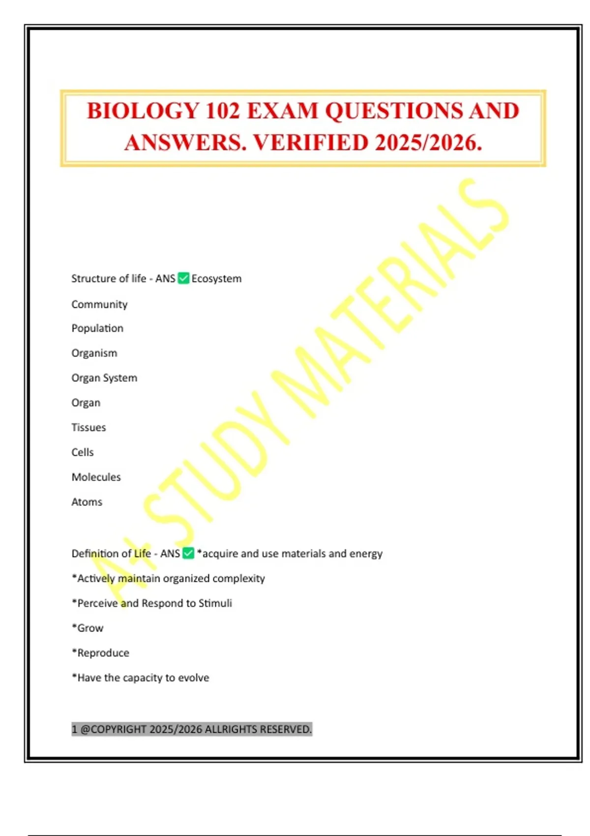 BIOLOGY 102 EXAM QUESTIONS AND ANSWERS. VERIFIED 2025/2026.