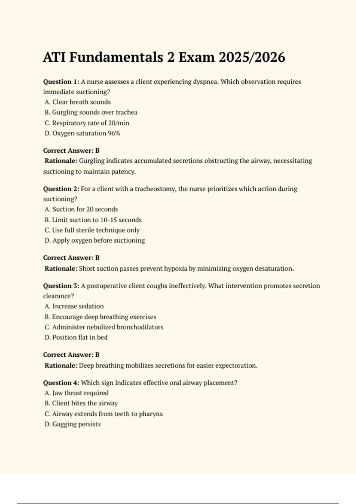 Question 2: For a client with a tracheostomy, the nurse prioritizes which action during