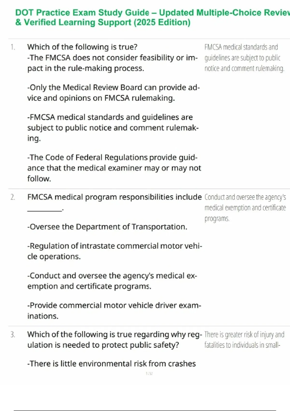 This DOT Practice Exam Study Guide provides learners with structured review content aligned to commonly assessed transportation regulations, safety compliance principles, workplace protocols, and professional requirements. Designed for academic preparation, this guide helps reinforce regulatory understanding, procedural accuracy, and scenario-based knowledge relevant to transportation-related examinations. Learners can utilize it to strengthen comprehension, evaluate readiness, and revisit foundational topics covered in training or certification-aligned coursework. Its organized presentation supports study planning, exam familiarity, and performance confidence for learners pursuing updated DOT-related academic objectives.