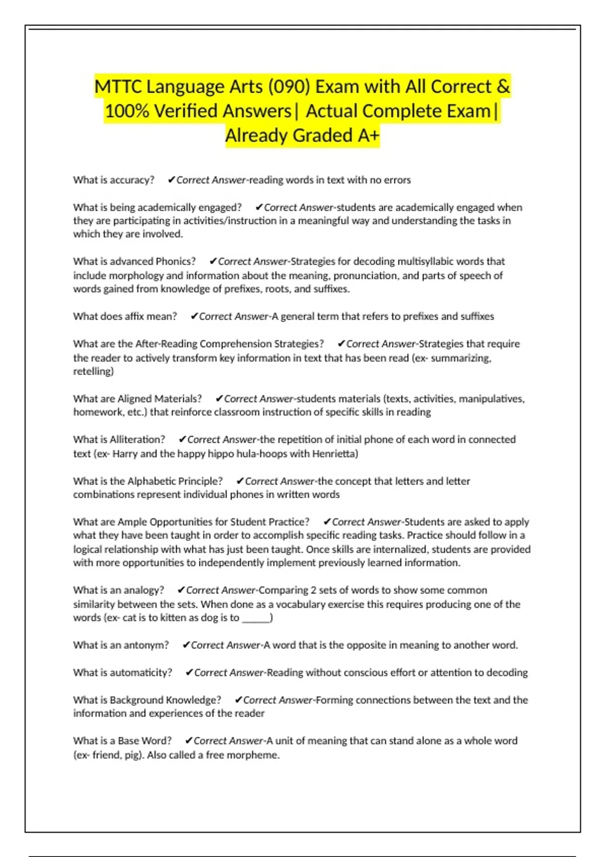 MTTC Language Arts (090) Exam with All Correct &