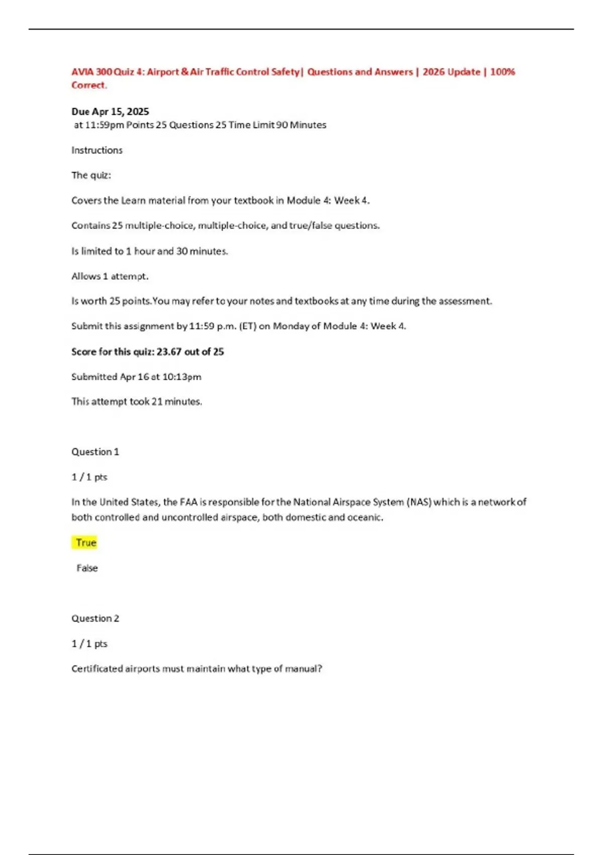 AVIA 300 Quiz 4: Airport & Air Traffic Control Safety| Questions and Answers | 2026 Update | 100% Correct.