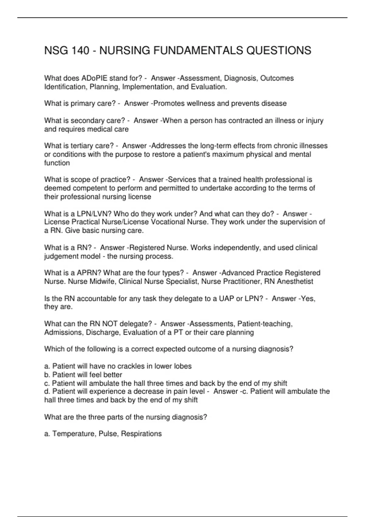 NSG 140 - NURSING FUNDAMENTALS QUESTIONS