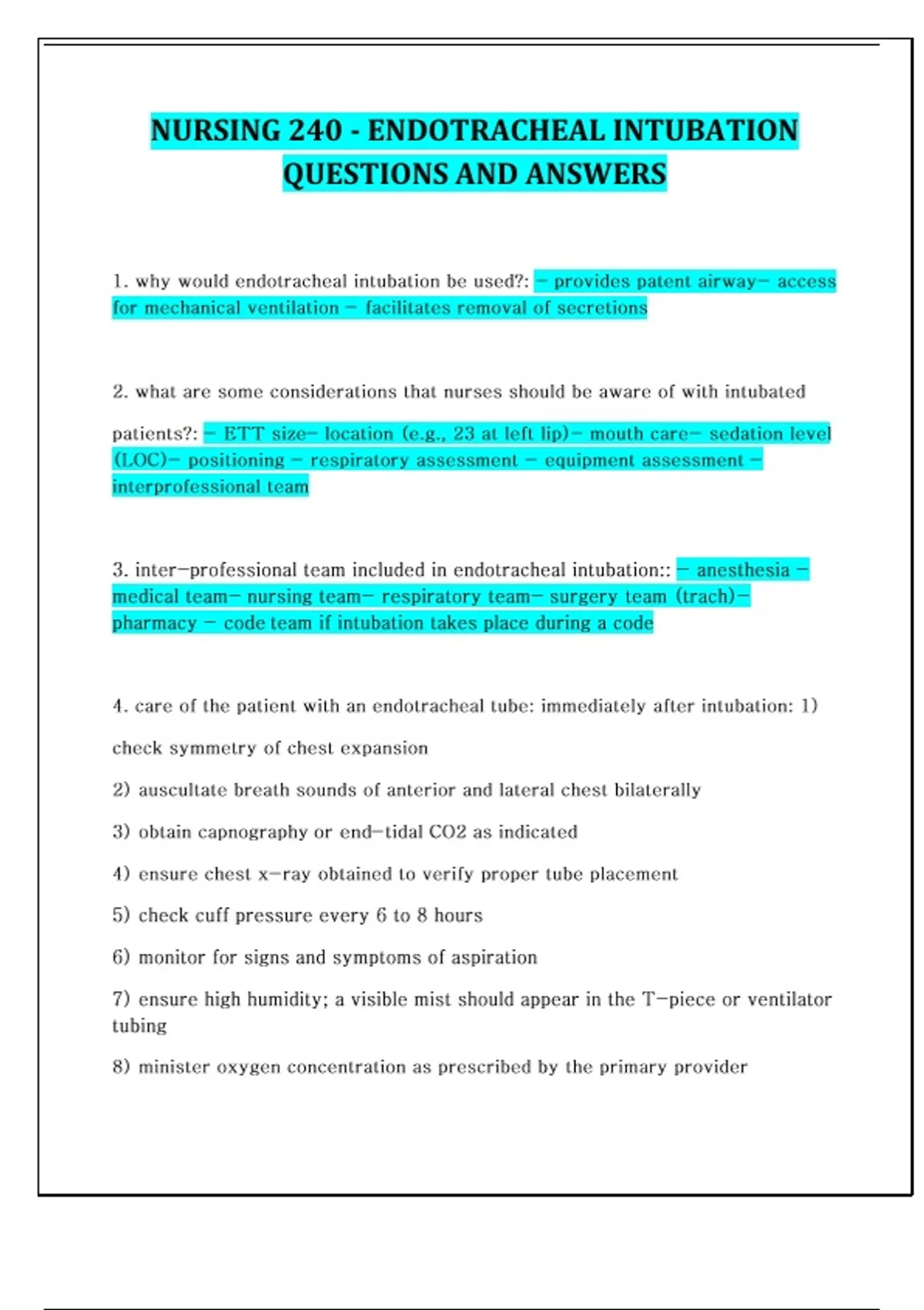 NURSING 240 - ENDOTRACHEAL INTUBATION QUESTIONS AND ANSWERS