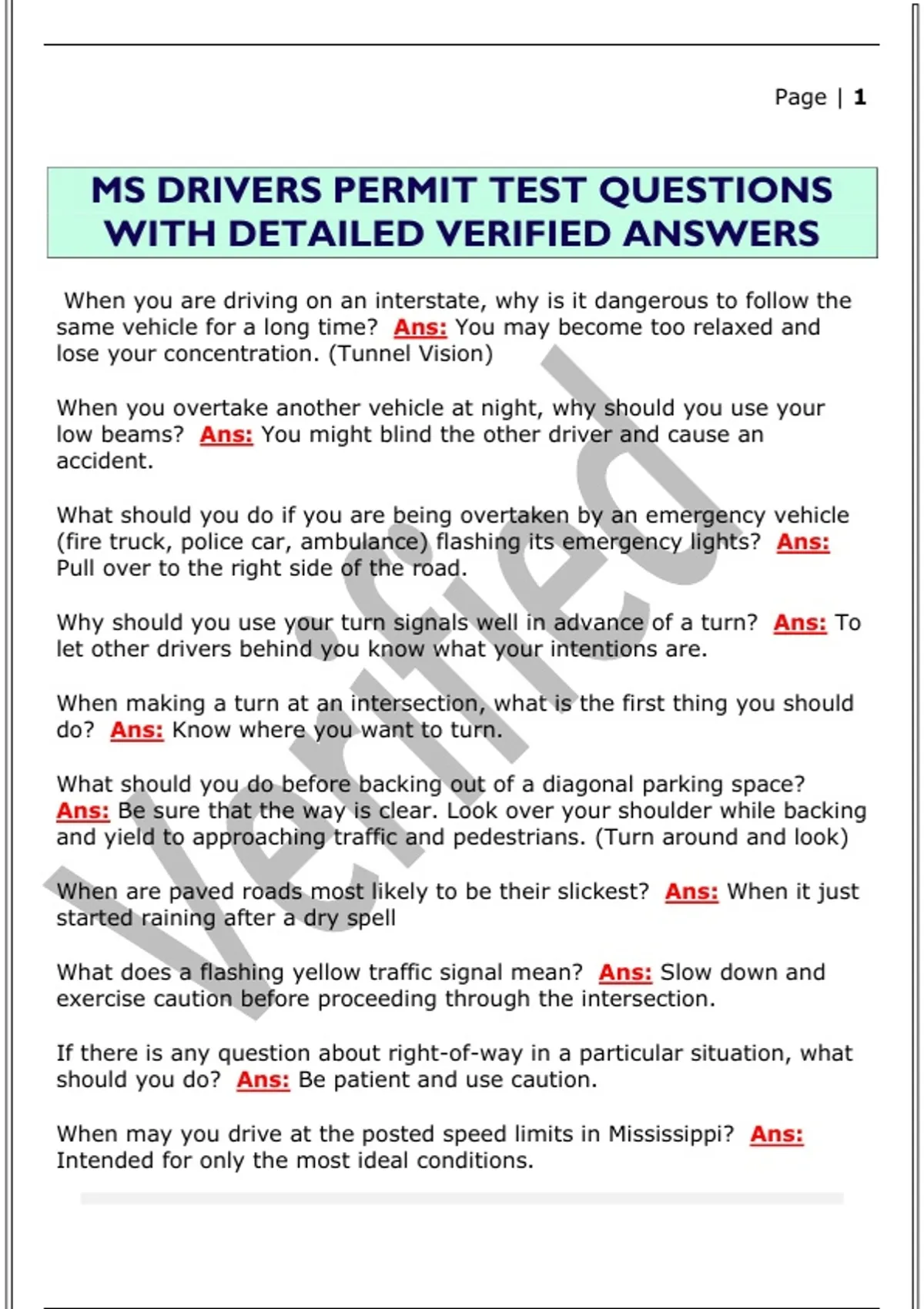 MS DRIVERS PERMIT TEST QUESTIONS WITH DETAILED VERIFIED ANSWERS