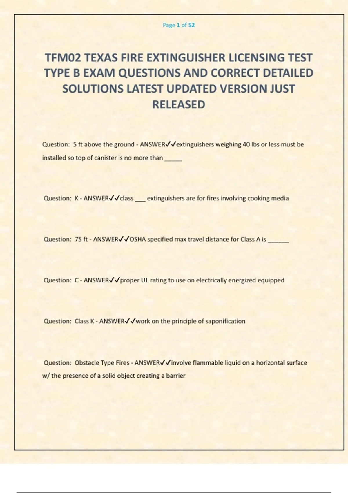 TFM02 TEXAS FIRE EXTINGUISHER LICENSING TEST TYPE B EXAM QUESTIONS AND CORRECT DETAILED SOLUTIONS LATEST UPDATED VERSION JUST RELEASED