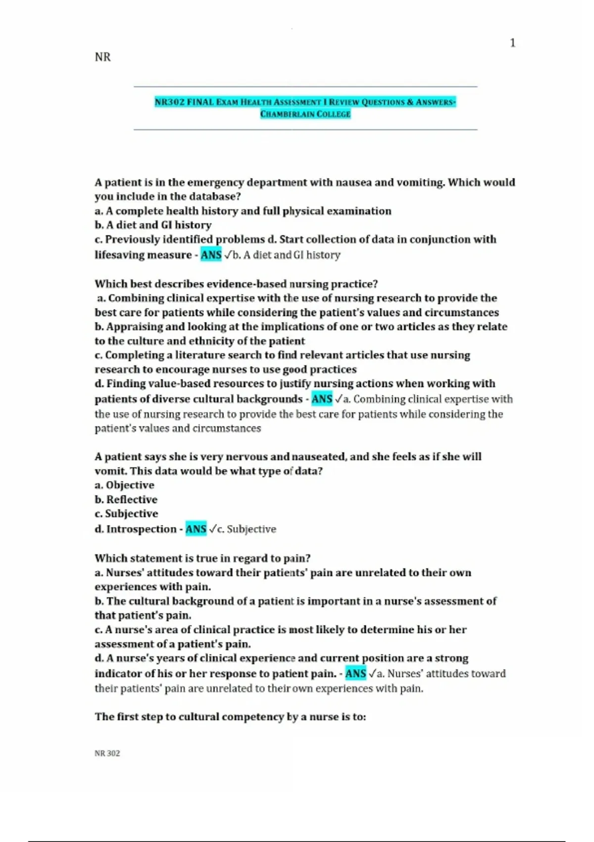 NR302 FINAL EXAM HEALTH ASSESSMENT I REVIEW QUESTIONS & ANSWERS-CHAMBERLAIN COLLEGENR302 FINAL EXAM HEALTH ASSESSMENT I REVIEW QUESTIONS & ANSWERS-CHAMBERLAIN COLLEGE