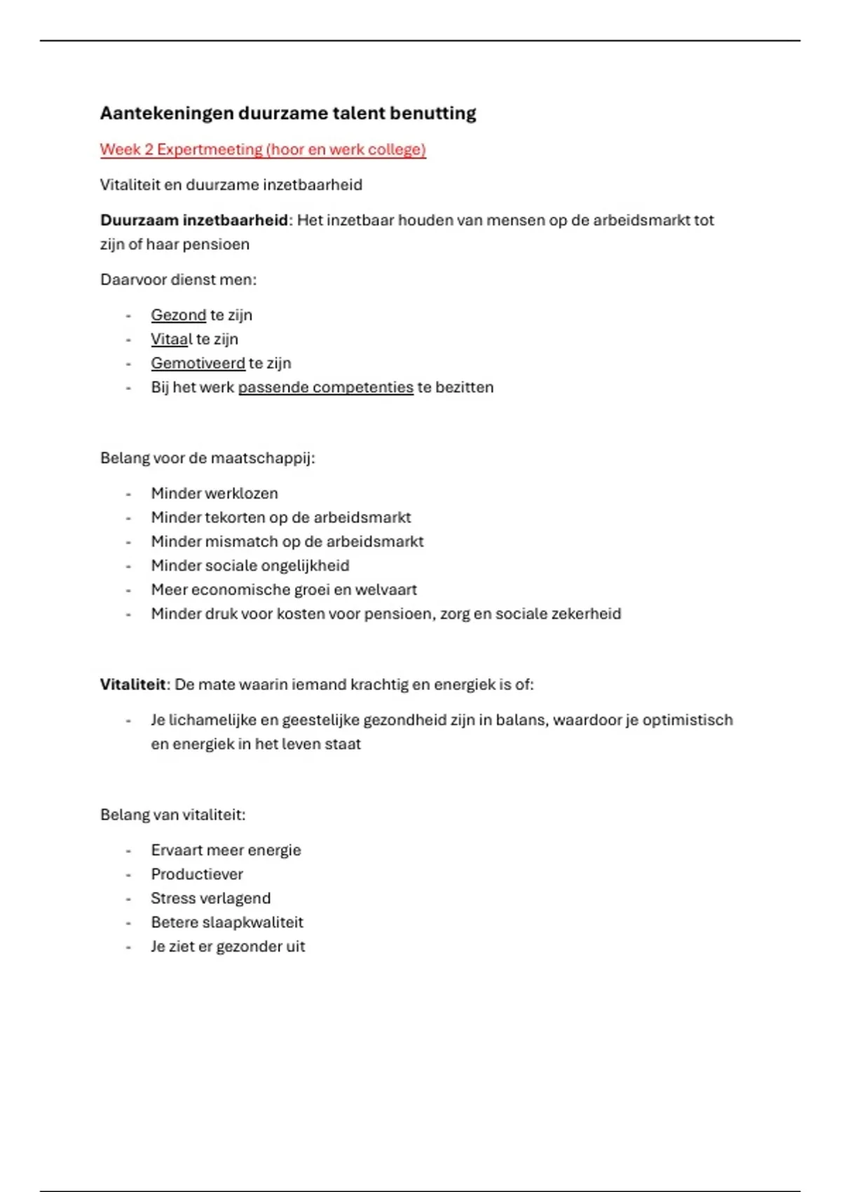 Dit is de samenvatting van de lessen & zelfstudie van het vak duurzame talent benutting. Ik heb hier een kennis toets over gehad en dit afgerond met een 7,8. Veel succes met leren!