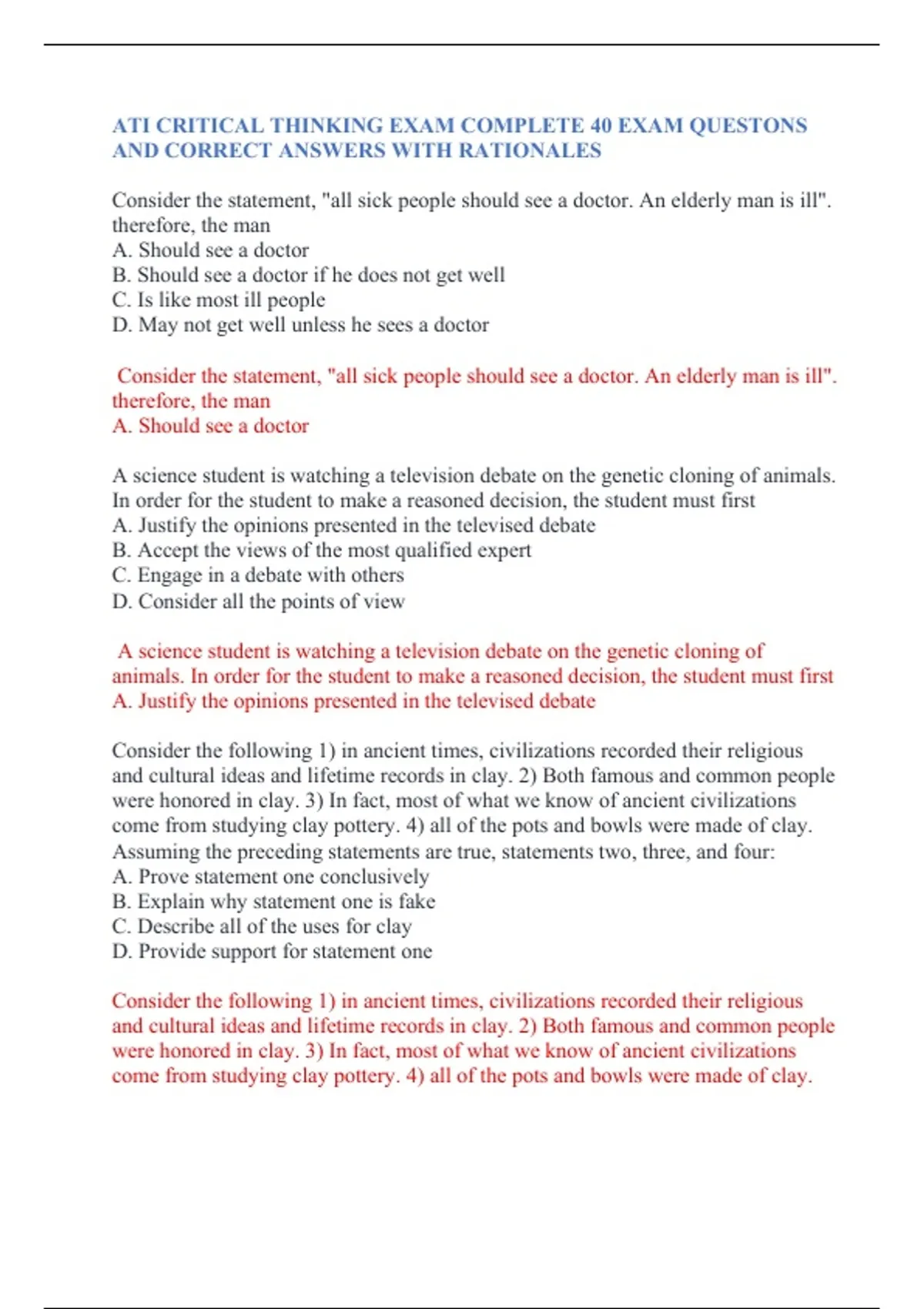 ATI CRITICAL THINKING EXAM COMPLETE 40 EXAM QUESTONS AND CORRECT ANSWERS WITH RATIONALES Consider the statement, "all sick people should see a doctor. An elderly man is ill". therefore, the man A. Should see a doctor B. Should see a doctor if he does not get well C. Is like most ill people D. May not get well unless he sees a doctor Consider the statement, "all sick people should see a doctor. An elderly man is ill". therefore, the man A. Should see a doctor A science student is watching a television debate on the genetic cloning of animals. In order for the student to make a reasoned decision, the student must first A. Justify the opinions presented in the televised debate B. Accept the views of the most qualified expert C. Engage in a debate with others D. Consider all the points of view A science student is watching a television debate on the genetic cloning of animals. In order for the student to make a reasoned decision, the student must first A. Justify the opinions presented in the televised debate Consider the following 1) in ancient times, civilizations recorded their religious and cultural ideas and lifetime records in clay. 2) Both famous and common people were honored in clay. 3) In fact, most of what we know of ancient civilizations come from studying clay pottery. 4) all of the pots and bowls were made of clay. Assuming the preceding statements are true, statements two, three, and four: A. Prove statement one conclusively B. Explain why statement one is fake C. Describe all of the uses for clay D. Provide support for statement one Consider the following 1) in ancient times, civilizations recorded their religious and cultural ideas and lifetime records in clay. 2) Both famous and common people were honored in clay. 3) In fact, most of what we know of ancient civilizations come from studying clay pottery. 4) all of the pots and bowls were made of clay. Assuming the preceding statements are true, statements two, three, and four: D. Provide support for statement one A school has seven classrooms: 1, 2, 3, 4, 5, 6, and 7. The principal must choose five students, each from a different classroom, to perform in a special play. Any combination of five students will be appropriate, except if a student from classroom 1 is selected, then no one from class 5 may be chosen. Also, if a student from class 3 is selected, then someone from classroom 5 must also be selected. If someone from classroom 2 is in the play, then a student from classroom 6 must also be selected. Which combination of students meets all of the criteria? 1. 1, 2, 3, 4, 5 2. 1, 4, 5, 6, 7, 3. 2, 3, 4, 5, 7 4. 2, 3, 4, 5, 6 A school has seven classrooms: 1, 2, 3, 4, 5, 6, and 7. The principal must choose five students, each from a different classroom, to perform in a special play. Any combination of five students will be appropriate, except if a student from classroom 1 is selected, then no one from class 5 may be chosen. Also, if a student from class 3 is selected, then someone from classroom 5 must also be selected. If someone from classroom 2 is in the play, then a student from classroom 6 must also be selected. Which combination of students meets all of the criteria? 4. 2, 3, 4, 5, 6