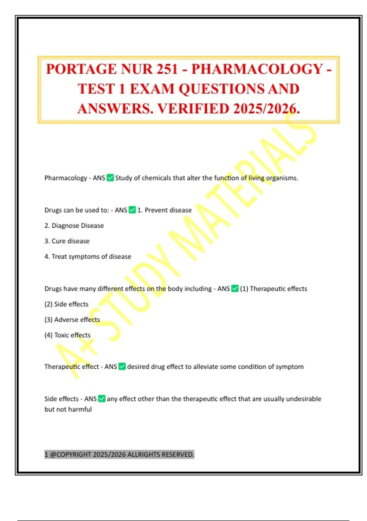 PORTAGE NUR 251 - PHARMACOLOGY - TEST 1 EXAM QUESTIONS AND ANSWERS. VERIFIED 2025/2026.