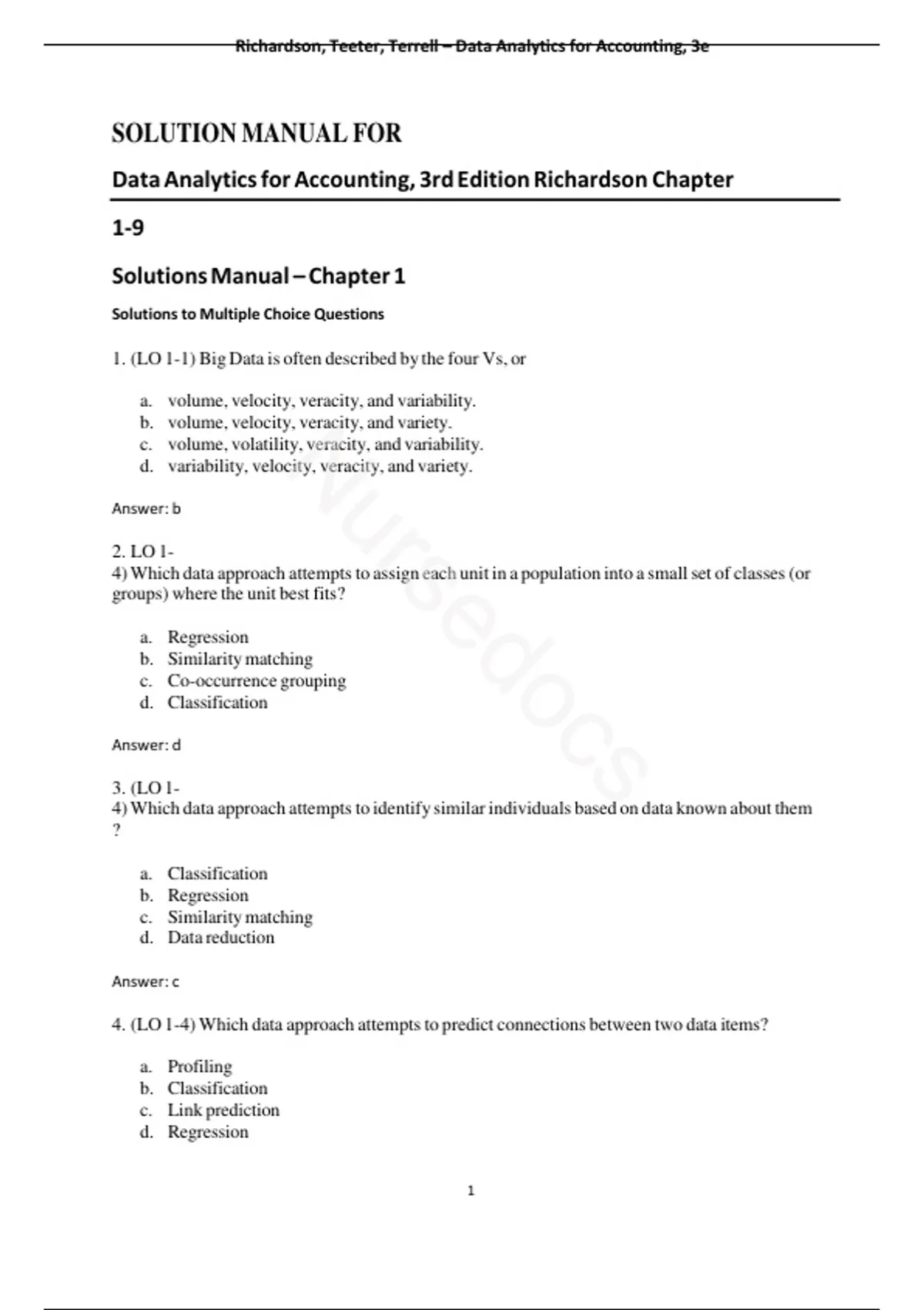This comprehensive Solution Manual for Data Analytics for Accounting, 3rd Edition by Richardson, Teeter, and Terrell provides detailed answers to all end-of-chapter questions, including multiple choice, discussion and analysis, and practical problems. Perfect for students, instructors, and professionals, it covers key topics such as: Big Data and the IMPACT cycle Data analytics approaches (classification, regression, similarity matching, etc.) ETL process and relational databases Audit analytics, continuous auditing, and internal controls Visualization techniques and dashboard design Managerial and tax analytics KPIs, financial statement analysis, and XBRL Includes step-by-step solutions, Excel and Tableau integrations, and real-world applications for accounting and auditing. Ideal for exam preparation, assignment help, and teaching support