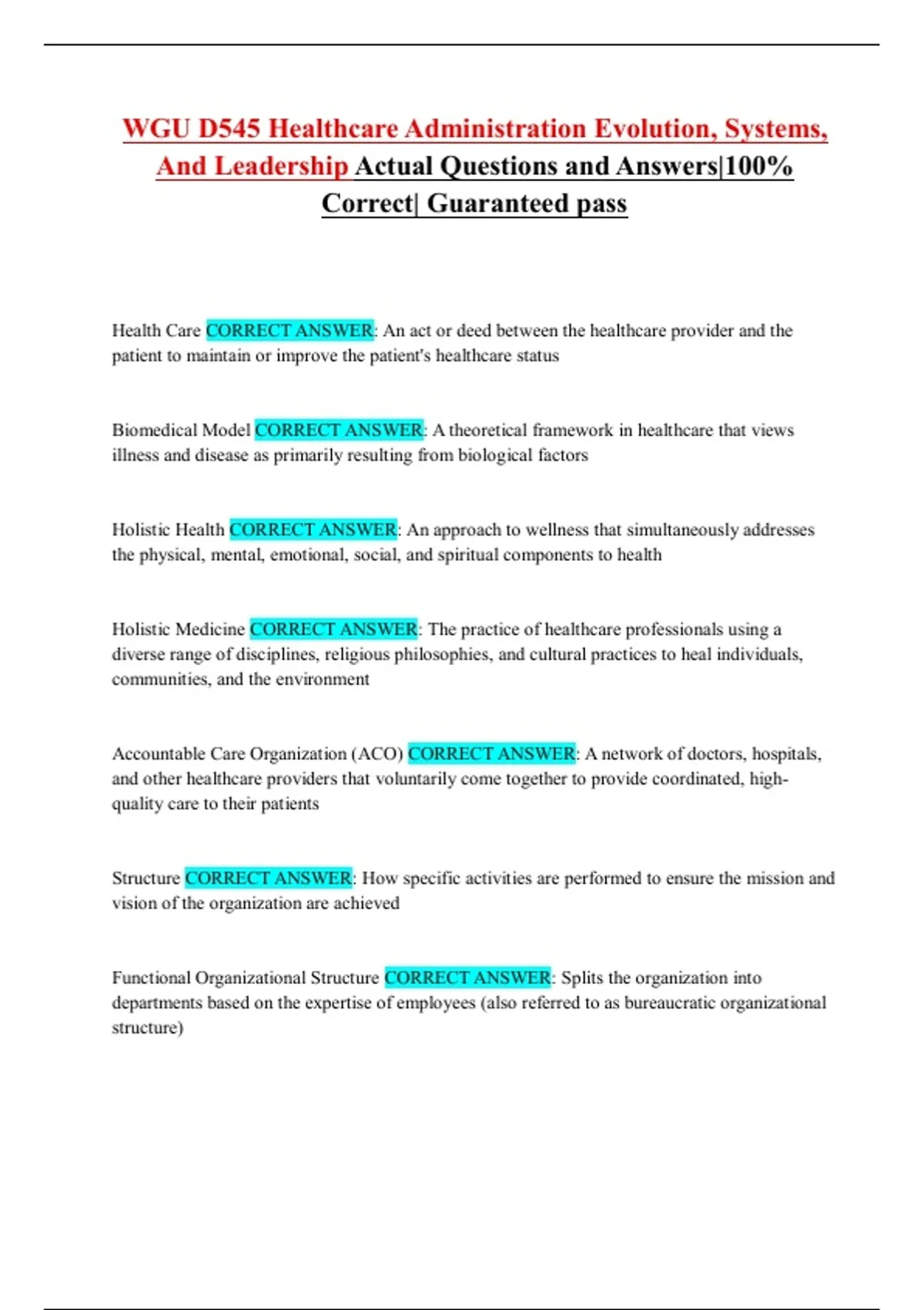 the full collection of verified questions and correct answers for WGU’s D545 Healthcare Administration course, focusing on the evolution of healthcare systems, organizational structures, analytics, leadership theories, ethics, and long-term care. It includes definitions, models, processes, and key concepts that appear on the course assessments. The material is comprehensive and supports complete preparation for both foundational and advanced topics in the exam.
