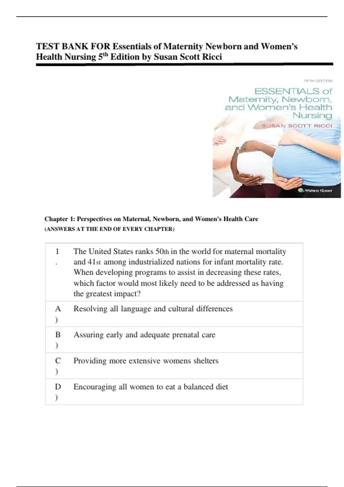 TEST BANK FOR Essentials of Maternity Newborn and Women's
