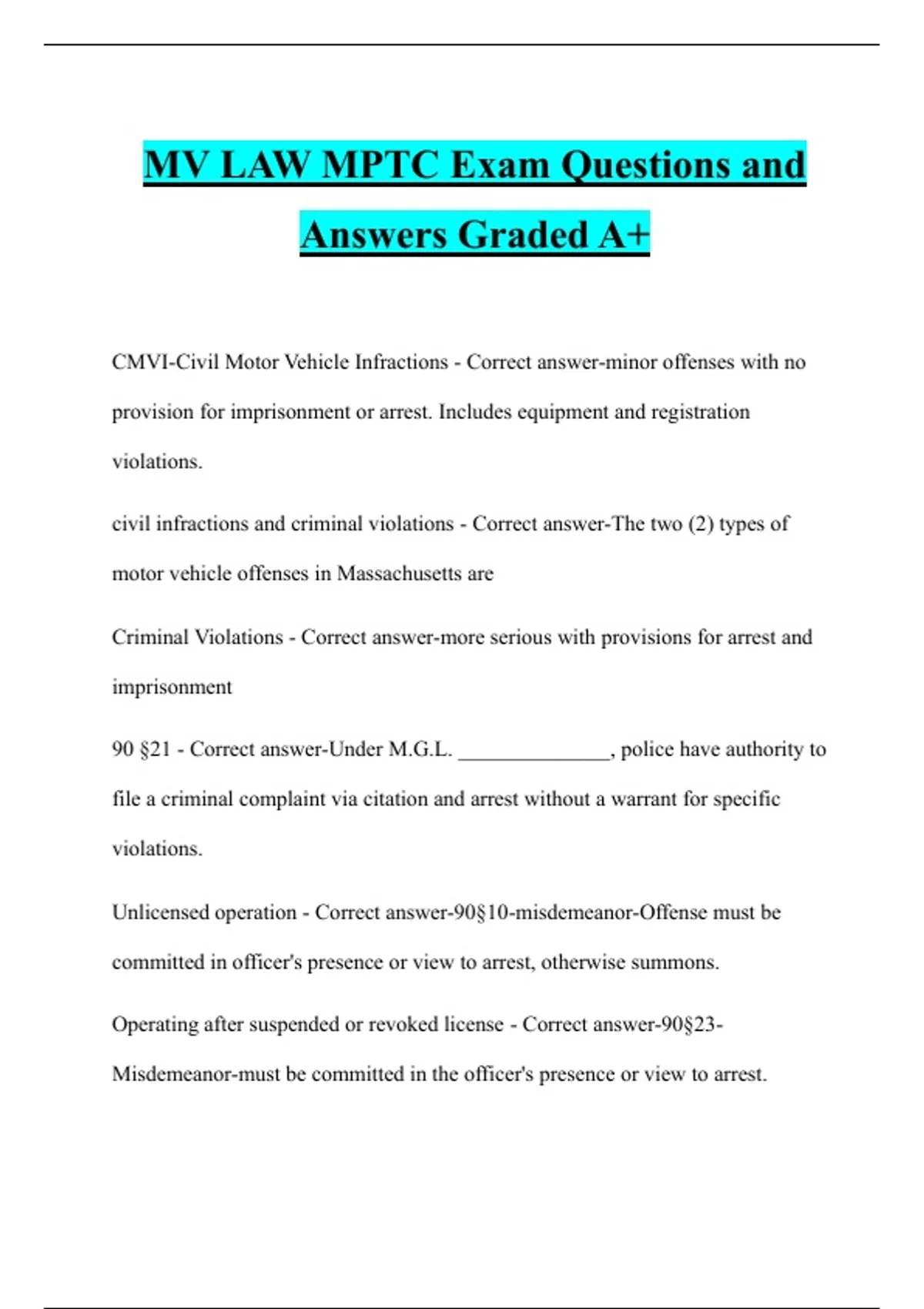MV LAW MPTC Exam Questions and