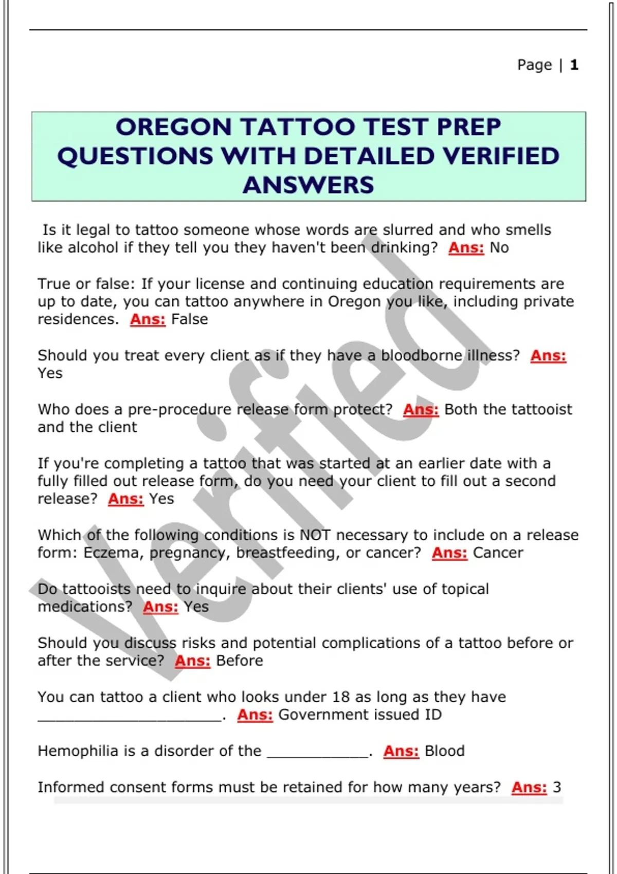 OREGON TATTOO TEST PREP QUESTIONS WITH DETAILED VERIFIED ANSWERS