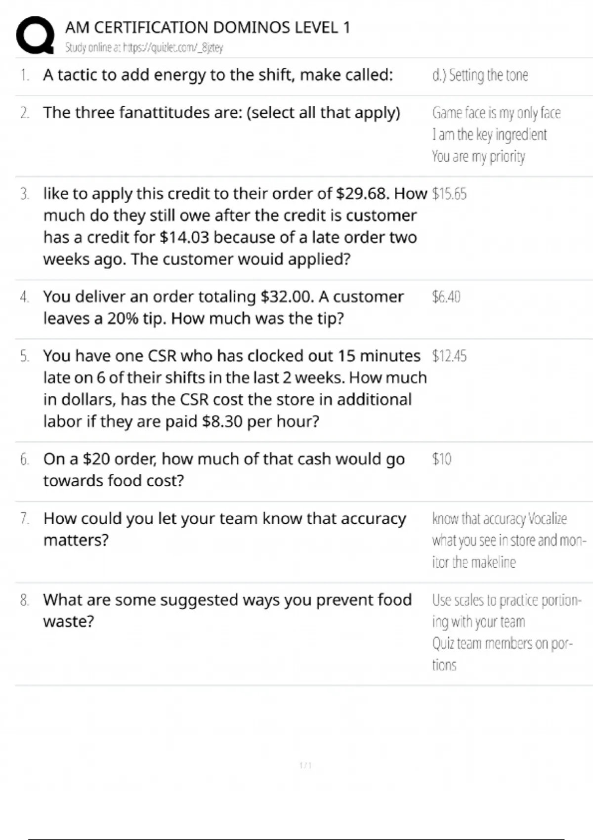 AM Certification Dominos Level 1 / Assistant Manager Training / 2025 Update / Score 100%