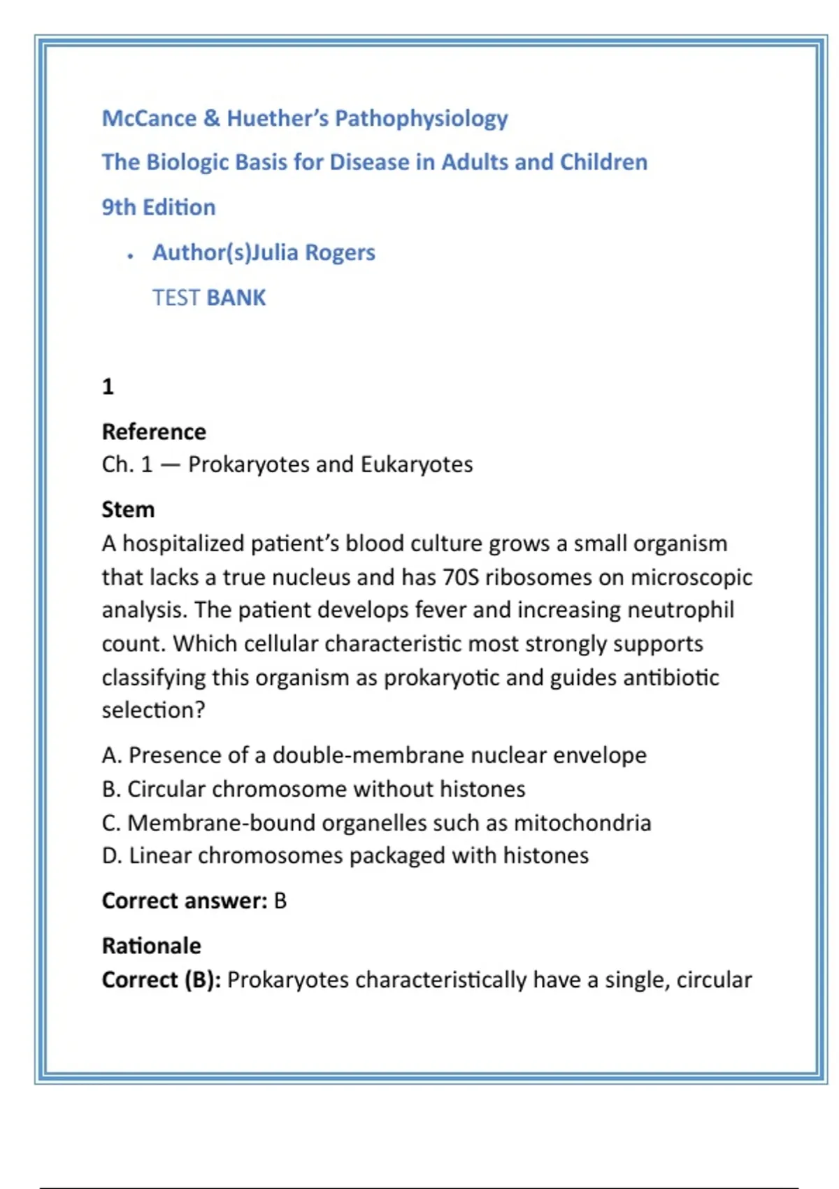 McCance & Huether Pathophysiology 9th Edition Test Bank | Rogers | 2025 MCQs + Verified Answers | Disease-Mechanism Review for Nursing & APRN Exams 2) SEO Product Description (200–300 words) Master advanced disease mechanisms with the McCance & Huether’s Pathophysiology: The Biologic Basis for Disease in Adults and Children, 9th Edition — Complete Test Bank. Built from the gold-standard text in clinical pathophysiology, this digital test bank delivers 20 high-quality, exam-aligned MCQs per chapter, each supported by verified answers and evidence-based rationales that strengthen clinical decision-making. Designed for nursing, APRN, medical, PA, and health-science learners, this updated 2025-level test bank boosts comprehension of complex pathophysiologic processes—helping you achieve 90–100% exam score improvement, stronger differential analysis, and confident mastery of system-based disease mechanisms. Every chapter targets the essential foundations of advanced pathophysiology, including: – Cellular injury, genetics, and epigenetics – Immunity, inflammation, and multisystem interactions – Endocrine, neurologic, cardiovascular, renal, respiratory, GI, hematologic & hepatic disorders – Pediatric vs. adult physiologic variations – Clinical-application scenario questions that mimic real exam style Perfect for pathophysiology course exams, nursing prerequisites, OSCE prep, NCLEX foundation strengthening, and graduate-level advanced practice courses, this resource accelerates your ability to integrate mechanisms of disease with clinical reasoning—exactly what modern health-profession programs require. Key Features Complete chapter-by-chapter McCance & Huether 9th Edition test bank 20 clinically relevant MCQs per chapter Verified answers with clear, evidence-based rationales 2025-updated disease-mechanism and system-based coverage High-yield clinical scenario questions for exam readiness Ideal for Nursing, APRN, PA, Medical & Health-Science programs Instant digital access for rapid study and score improvement Achieve true mastery of advanced pathophysiology and walk into every exam with confidence. 3) 8 High-Value SEO Keywords McCance Huether 9th Edition test bank Rogers pathophysiology test bank Pathophysiology MCQs 2025 Advanced disease mechanism questions Clinical reasoning pathophysiology review Nursing APRN pathophysiology test bank Evidence-based answer rationales Systems-based pathophysiology exam prep 4) 10 Hashtags #pathophysiology #advancedpatho #nursingexamprep #APRNstudy #medicalsciencereview #clinicalreasoning #diseasemechanisms #MCQtestbank #healthsciencestudy #examreadiness