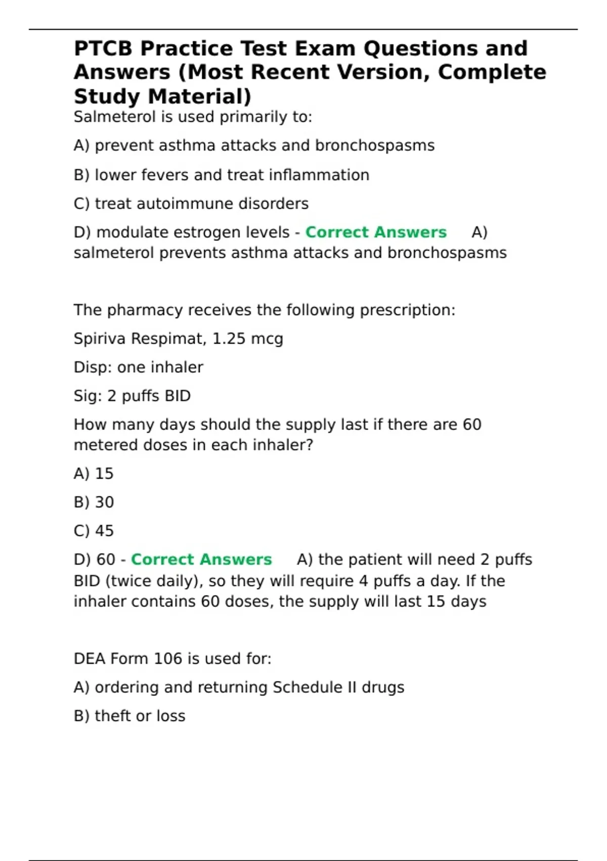 PTCB Practice Test Exam Questions and Answers (Most Recent Version, Complete Study Material)
