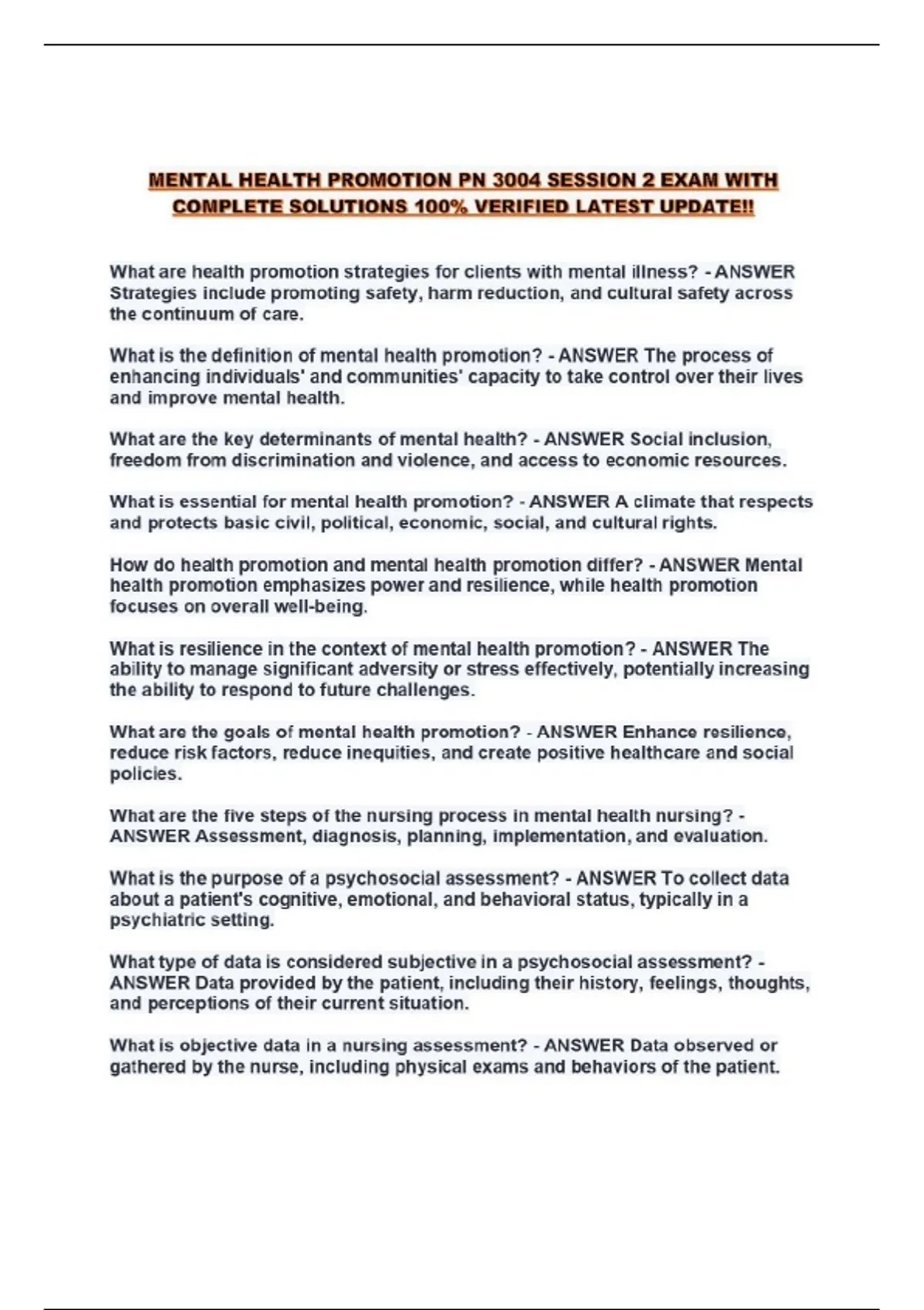MENTAL HEALTH PROMOTION PN 3004 SESSION 2 EXAM WITH COMPLETE SOLUTIONS 100% VERIFIED LATEST UPDATE!!...