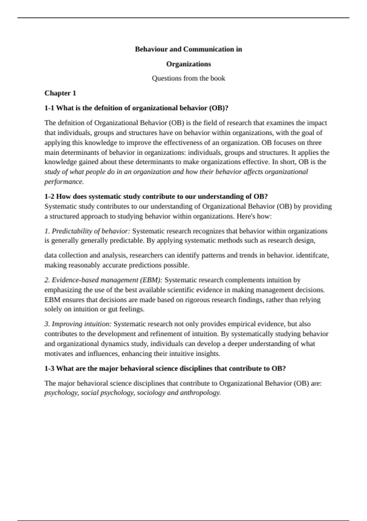 1-3 What are the major behavioral science disciplines that contribute to OB?