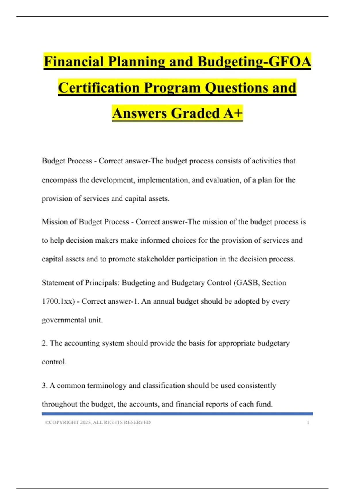 Financial Planning and Budgeting-GFOA Certification Program Questions and Answers Graded A+