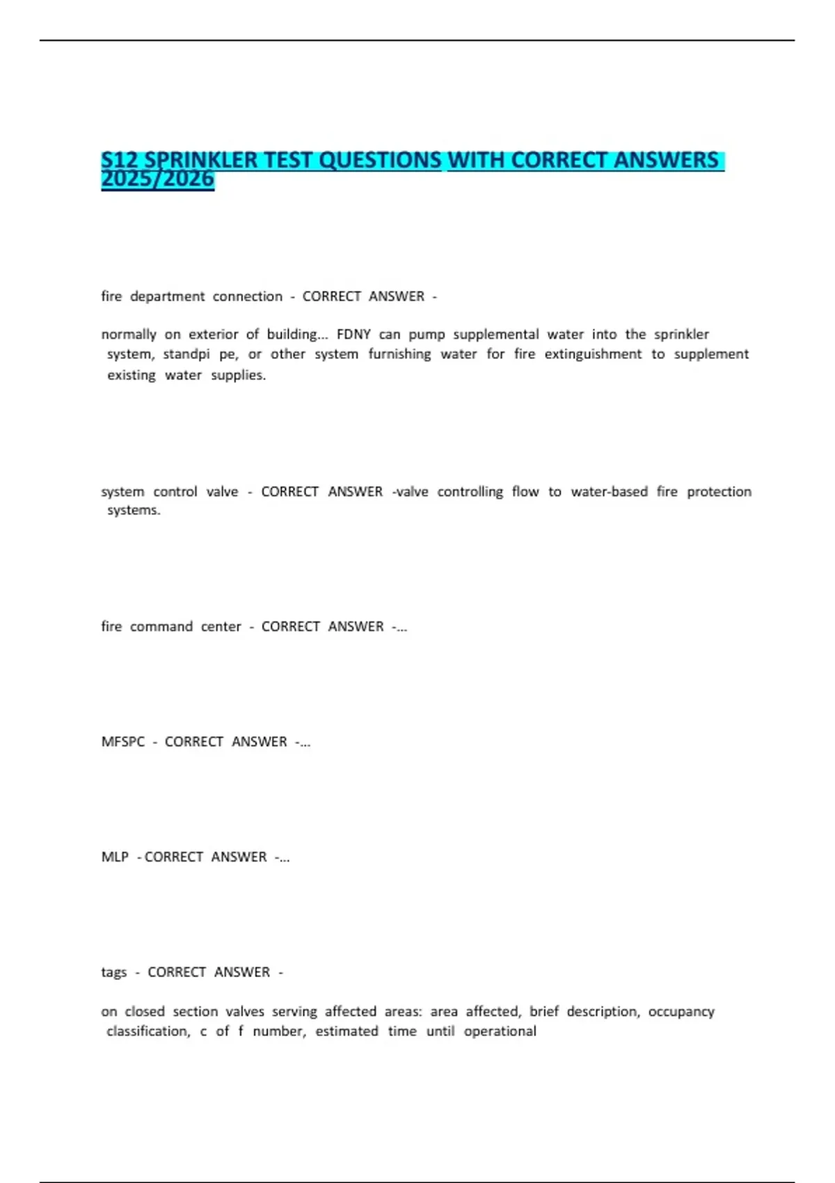 S12 SPRINKLER TEST QUESTIONS WITH CORRECT ANSWERS
