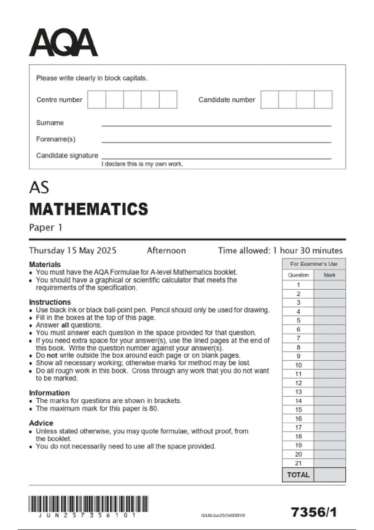 ACTUAL 2025 AQA AS LEVEL MATHEMATICS PAPER 1 7356/1 QUESTION PAPER