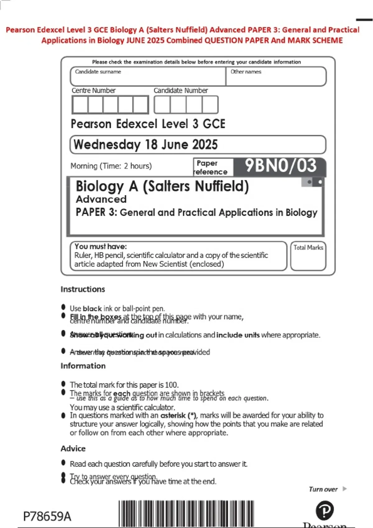 Pearson Edexcel Level 3 GCE Biology A (Salters Nuffield) Advanced PAPER 3: General and Practical Applications in Biology JUNE 2025 Combined QUESTION PAPER And MARK SCHEME