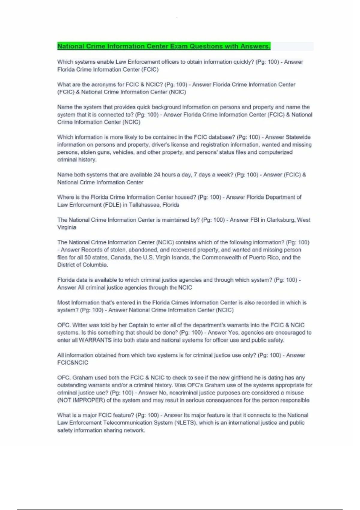 National Crime Information Center Exam Questions with Answers.National Crime Information Center Exam Questions with Answers.