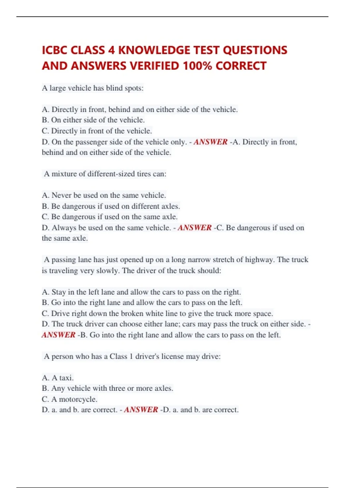 ICBC CLASS 4 KNOWLEDGE TEST QUESTIONS AND ANSWERS VERIFIED 100% CORRECT A large vehicle has blind spots: A. Directly in front, behind and on either side of the vehicle. B. On either side of the vehicle. C. Directly in front of the vehicle. D. On the passenger side of the vehicle only. - ANSWER -A. Directly in front, behind and on either side of the vehicle. A mixture of different-sized tires can: A. Never be used on the same vehicle. B. Be dangerous if used on different axles. C. Be dangerous if used on the same axle. D. Always be used on the same vehicle. - ANSWER -C. Be dangerous if used on the same axle. A passing lane has just opened up on a long narrow stretch of highway. The truck is traveling very slowly. The driver of the truck should: A. Stay in the left lane and allow the cars to pass on the right. B. Go into the right lane and allow the cars to pass on the left. C. Drive right down the broken white line to give the truck more space. D. The truck driver can choose either lane; cars may pass the truck on either side. - ANSWER -B. Go into the right lane and allow the cars to pass on the left. A person who has a Class 1 driver's license may drive: A. A taxi. B. Any vehicle with three or more axles. C. A motorcycle. D. a. and b. are correct. - ANSWER -D. a. and b. are correct. A sleeper berth does not include: A. The back seat of a bus. B. A reclining seat. C. A designated area of your truck designed for sleeping. D. A. and B are correct. - ANSWER -D. A. and B are correct. A red triangle Slow Moving Vehicle sign should be placed on any vehicle that travels at less than: A. 30 km/h B. 50 km/h C. 60 km/h D. 40 km/h - ANSWER -D. 40 km/h A vehicle that is twice the weight of a car and is traveling at twice the speed of that car requires how much braking power to stop in the same distance: A. 2 times the stopping power. B. 4 times the stopping power. C. 6 times the stopping power. D. 8 times the stopping power. - ANSWER -D. 8 times the stopping power. Adjusting your head restraint so that it is at least level with the top of your ears is: A. A great way to make driving more relaxing. B. Important in reducing the risk of soft tissue neck and back injuries during a rear end crash. C. Illegal. D. More comfortable. - ANSWER -B. Important in reducing the risk of soft tissue neck and back injuries during a rear-end crash. After working 120 hours in a 14-day cycle, drivers must take ____________ hours of off-duty time before working 70 hours of on-duty time. A. 16 B. 8 C. 36 D. 24 - ANSWER -D. 24 Air bags are: A. A good alternative to seat belts. B. Part of all commercial vehicles. C. Dangerous if you are seated less than 25 centimetres away from the air bag unit in the steering wheel. D. Unnecessary. - ANSWER -C. Dangerous if you are seated less than 25 centimetres away from the air bag unit in the steering wheel. Amber flashing lights can be mounted on a vehicle if: A. It is a disabled vehicle. B. It is a commercial vehicle. C. It is a police car. D. You have a Commercial Vehicle Safety & Enforcement permit from ICBC. - ANSWER -D. You have a Commercial Vehicle Safety & Enforcement permit from ICBC. An appropriate gear for entering a curve is: A. One that allows you to complete your progression around the curve while also using the brakes. B. One that allows you to complete your progression around the curve while using engine power throughout. C. One that allows you to complete your progression around the curve while using neither the gas pedal nor the brake. D. Second gear. - ANSWER -B. One that allows you to complete your progression around the curve while using engine power throughout.