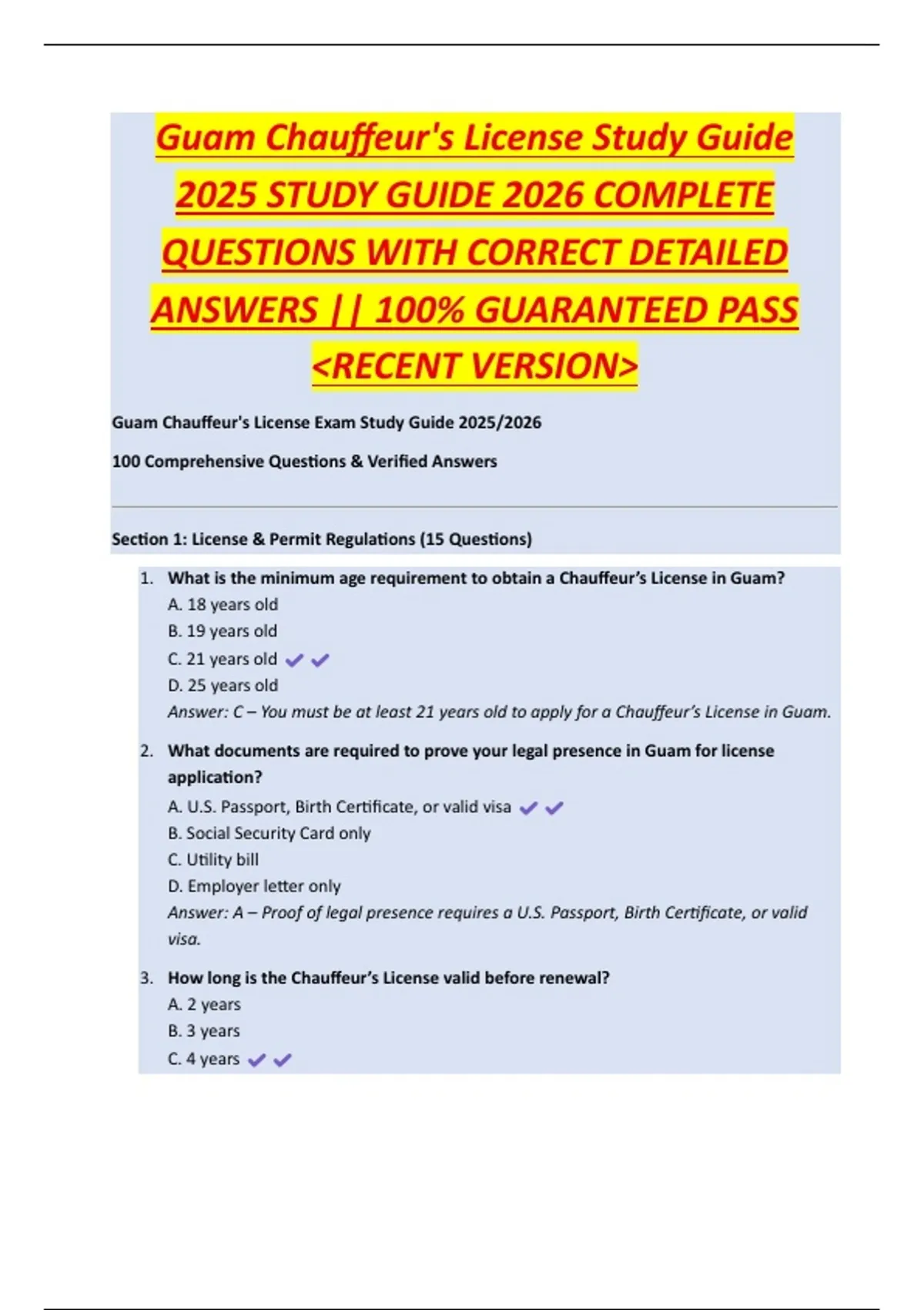 Answer: C – You must be at least 21 years old to apply for a Chauffeur’s License in Guam.