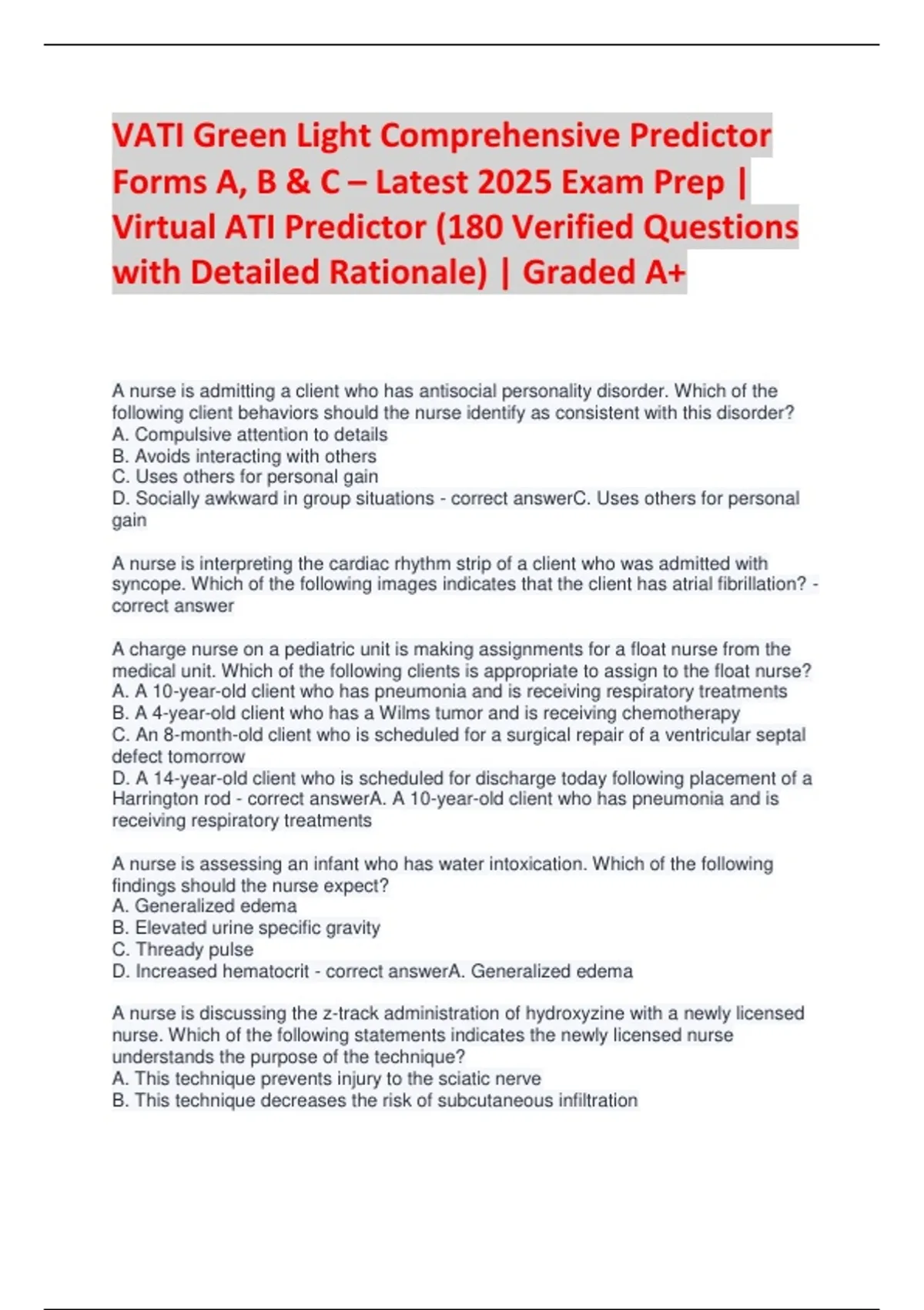 Ace the VATI Green Light Comprehensive Predictor with this latest 2025 exam prep guide. Includes Forms A, B & C with 180 fully verified questions and detailed rationales, designed to help nursing students identify strengths, improve weak areas, and achieve top scores. Graded A+, this guide ensures thorough preparation and boosts exam confidence