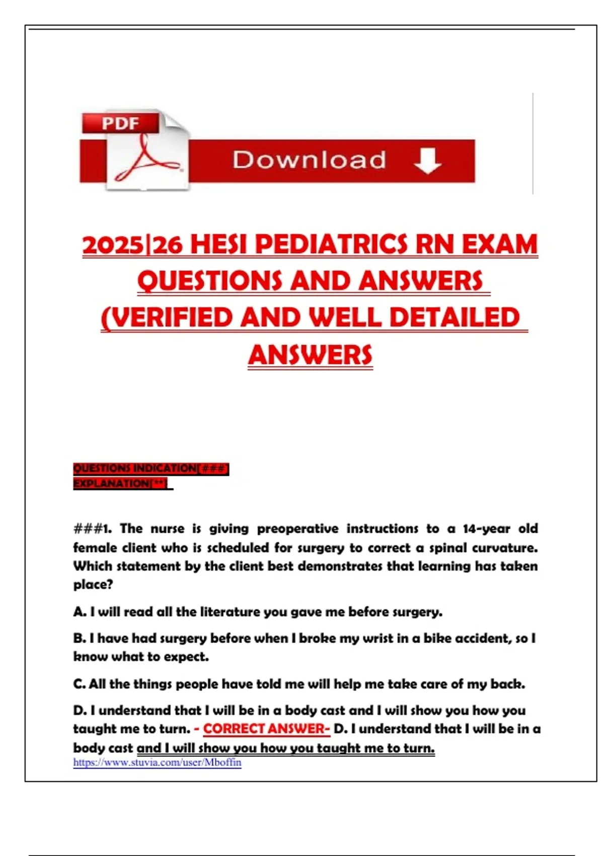 2025|26 HESI PEDIATRICS RN EXAM QUESTIONS AND ANSWERS (VERIFIED AND WELL DETAILED ANSWERS