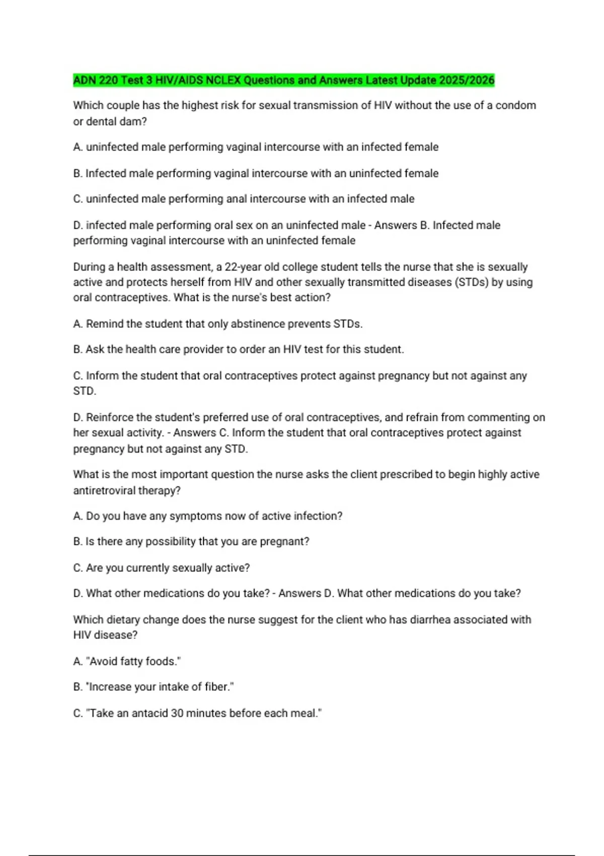 ADN 220 Test 3 HIV/AIDS NCLEX Questions and Answers Latest Update 2025/2026 Which couple has the highest risk for sexual transmission of HIV without the use of a condom or dental dam? A. uninfected male performing vaginal intercourse with an infected female B. Infected male performing vaginal intercourse with an uninfected female C. uninfected male performing anal intercourse with an infected male D. infected male performing oral sex on an uninfected male - Answers B. Infected male performing vaginal intercourse with an uninfected female During a health assessment, a 22-year old college student tells the nurse that she is sexually active and protects herself from HIV and other sexually transmitted diseases (STDs) by using oral contraceptives. What is the nurse's best action? A. Remind the student that only abstinence prevents STDs. B. Ask the health care provider to order an HIV test for this student. C. Inform the student that oral contraceptives protect against pregnancy but not against any STD. D. Reinforce the student's preferred use of oral contraceptives, and refrain from commenting on her sexual activity. - Answers C. Inform the student that oral contraceptives protect against pregnancy but not against any STD. What is the most important question the nurse asks the client prescribed to begin highly active antiretroviral therapy? A. Do you have any symptoms now of active infection? B. Is there any possibility that you are pregnant? C. Are you currently sexually active? D. What other medications do you take? - Answers D. What other medications do you take? Which dietary change does the nurse suggest for the client who has diarrhea associated with HIV disease? A. "Avoid fatty foods." B. "Increase your intake of fiber." C. "Take an antacid 30 minutes before each meal." D. "Restrict your intake of fluids to 1 liter per day." - Answers A. "Avoid fatty foods." The nurse is providing counseling to a woman who is HIV positive and has just discovered that she is pregnant. Which anti-HIV drug is given to HIV-infected pregnant women to prevent transmission of the virus to the infant? A. Acyclovir (Zovirax) B. Zidovudine (Retrovir) C. Ribavirin (Virazole) D. Foscarnet (Foscavir) - Answers B. Zidovudine Zidovudine, along with various other antiretroviral drugs, is given to HIV-infected pregnant women and even to newborn babies to prevent maternal transmission of the virus to the infant. The other drugs are non-HIV antiviral drugs A patient is in the HIV clinic for a follow-up appointment. He has been on antiretroviral therapy for HIV for more than 3 years. The nurse will assess for which potential adverse effects of long-term antiretroviral therapy? (select all that apply). A. Lipodystrophy B. Liver damage C. Kaposi's sarcoma D. Osteoporosis E. Type 2 diabetes - Answers A, B, D, E Anti-HIV drugs produce strain on the liver and may result in liver disease. A major adverse effect of protease inhibitors is lipid abnormalities, including lipodystrophy, or redistribution of fat stores under the skin. In addition, dyslipidemias, such as hypertriglyceridemia can occur, and insulin resistance and type 2 diabetes symptoms can result. The increase in long-term antiretroviral drug therapy due to prolonged disease survival has led to the emergence of another long-term adverse effect associated with these medications - bone demineralization and possible osteoporosis. Kaposi's sarcoma is an opportunistic disease associated with HIV, not a result of long-term drug therapy. The nurse prepares to give a bath and change the bed linens of a client with cutaneous Kaposi's sarcoma lesions. The lesions are open and draining a scant amount of serous fluid. Which would the nurse incorporate into the plan during the bathing of this client?