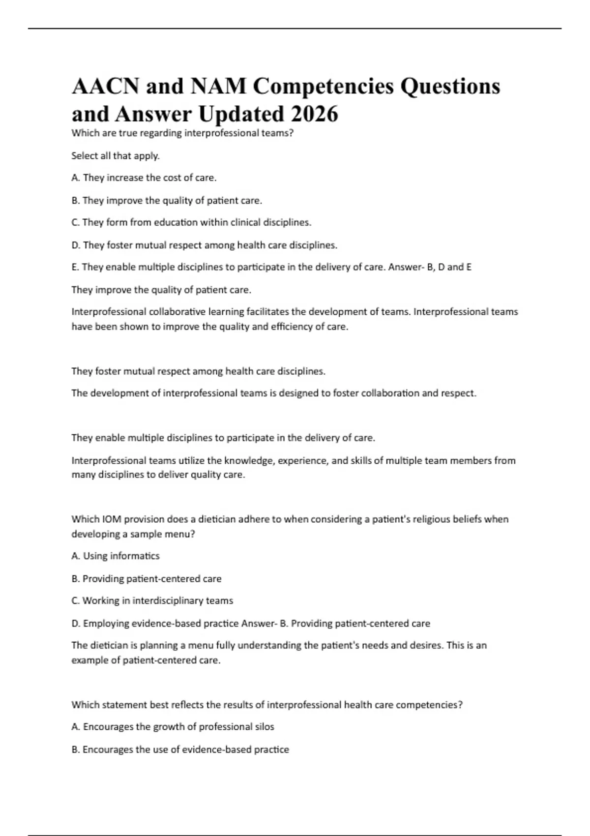 AACN and NAM Competencies Questions