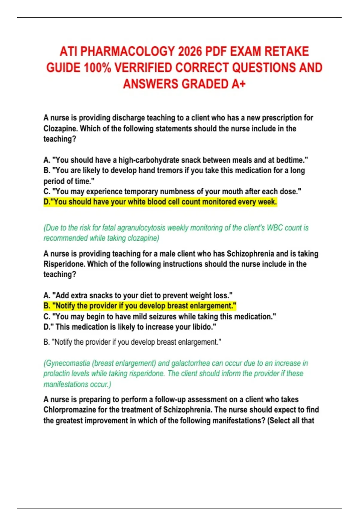 ATI PHARMACOLOGY 2026 PDF EXAM RETAKE GUIDE 100% VERRIFIED CORRECT QUESTIONS AND ANSWERS GRADED A+