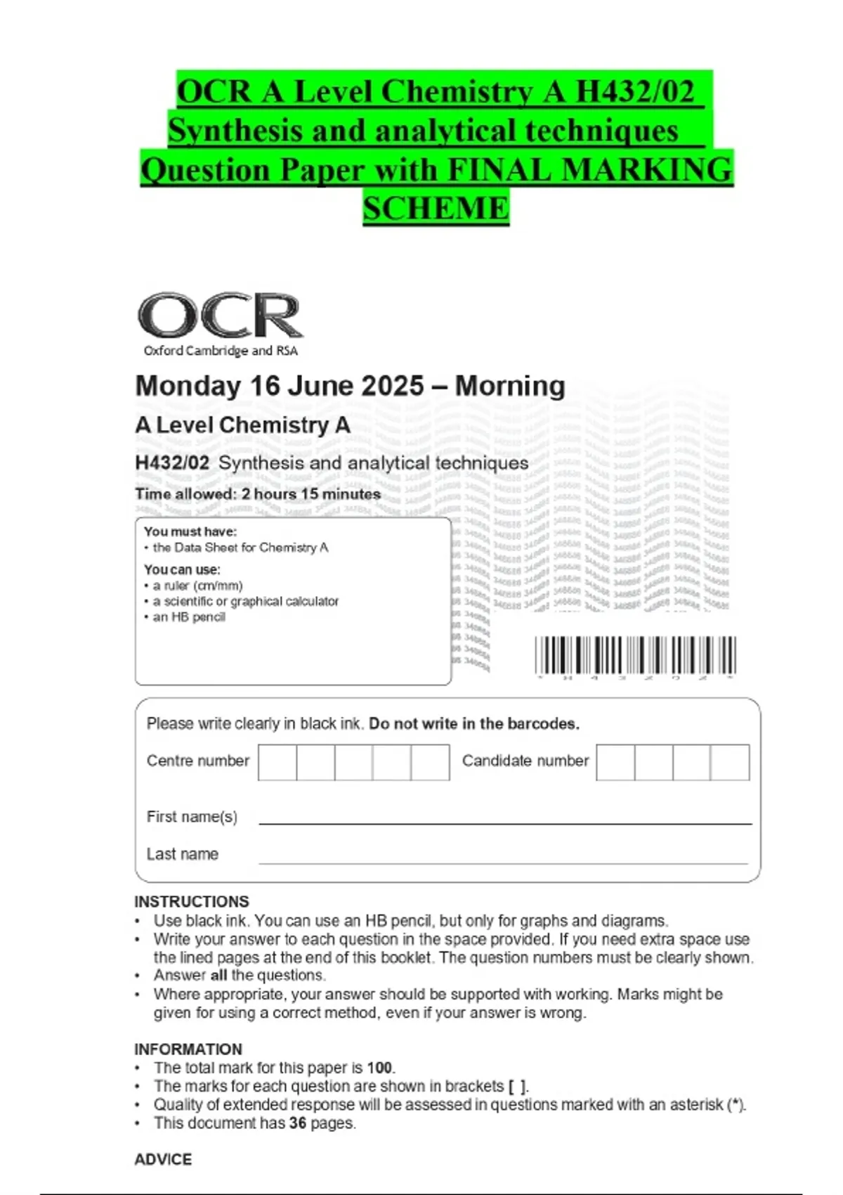 OCR A Level Chemistry A H432/02 Synthesis and analytical techniques Question Paper with FINAL MARKING SCHEME