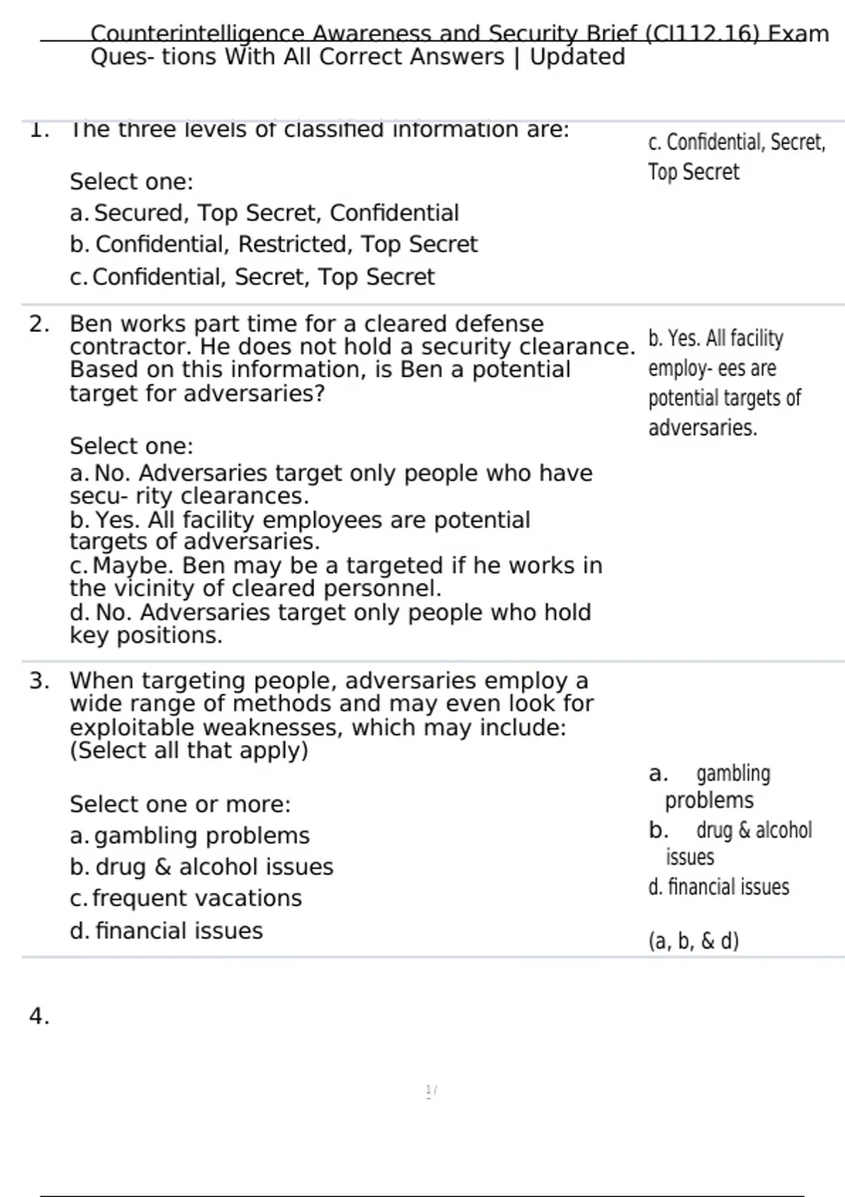 Counterintelligence Awareness and Security Brief (CI112.16) Exam Questions With All Correct Answers | Updated